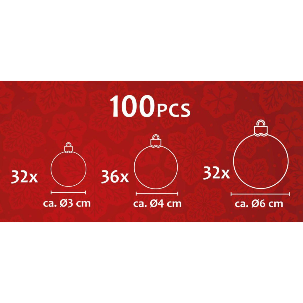 • A készlet 100 gömbdíszt tartalmaz három különböző átmérőben és textúrában