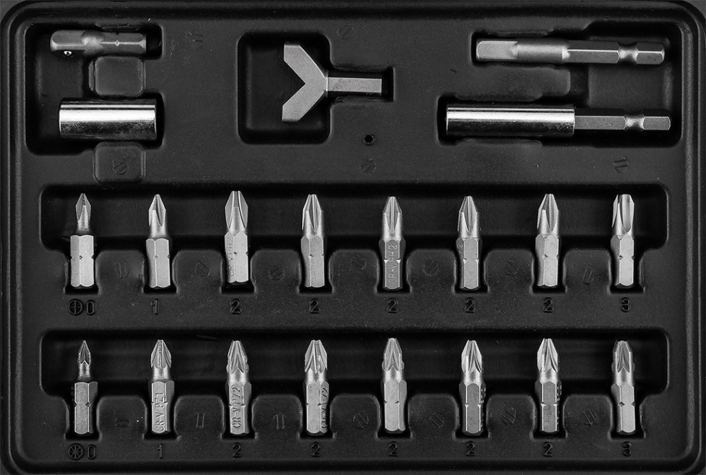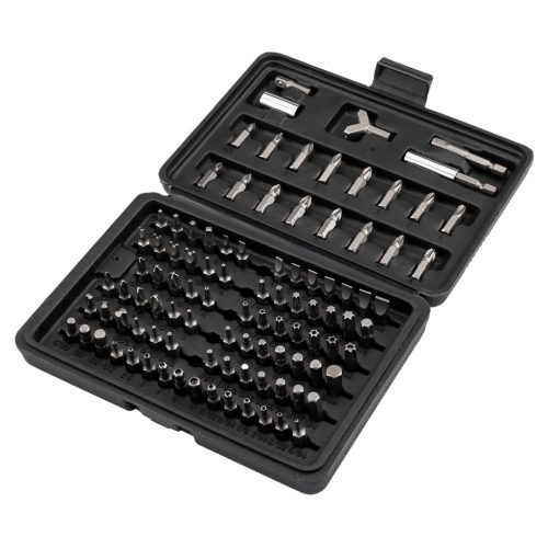 H1.5/2/2.5/3/4/5/5.5/6/8/, 1/16", 5/64", 3/32", 7/64", 1/8", 9/64", 5/32", 3/16", 7/32", 1/4", HH2/2.5/3/4/5/6/,5/64", 3/32", 7/64", 1/8", 9/64", 5/32", SQ0/1/2/3, CG1/2/3, PH0/1/2/2/2/2/2/3, PZ0/1/2/2/2/2/2/3, SN4/6/8/10, TX8/10/15/20/25/27/30/40/45, TW1/2/3/4, SP5/6/8, TT8/10/15/20/25/27/30/35/40, TS6/8/10, SL3/4/4,5/5/5,5/6/6,5/7/8 x 25 mm, mágneses tartóval 60 mm, adapter 1/4" Hex - 1/4" négyzet alakú, 25 mm hosszú, adapter 1/4" Hex - 1/4" négyzet alakú, 50 mm hosszú, adapter 1/4" Hex - 1/4" négyzet alakú, bit horgok csavarozásához, 100 darabos készlet, CrV acél