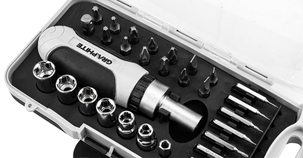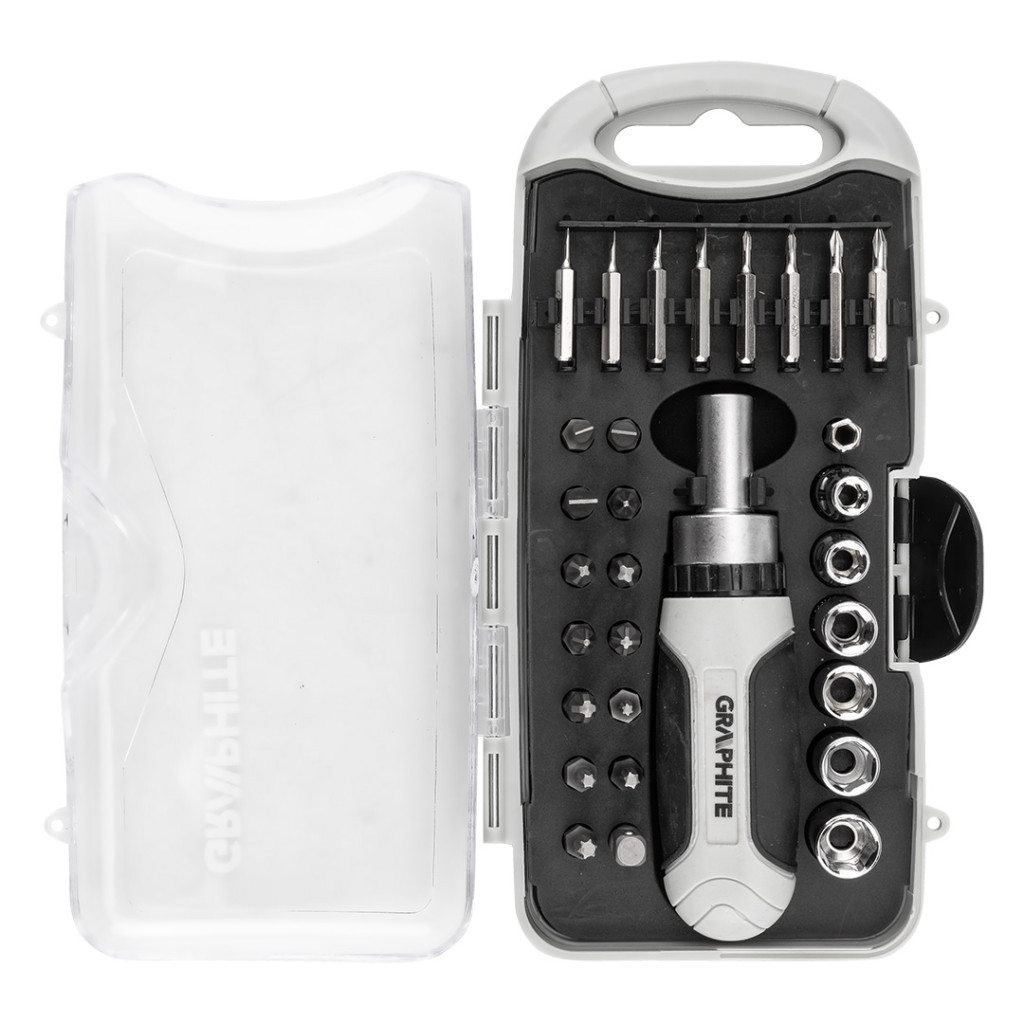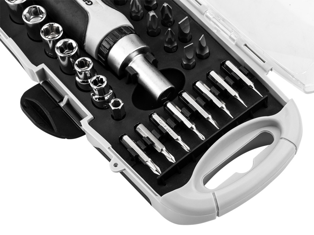 Bitkészlet: SL4/5/6, PH1/2/3, PZ1/2/3, TX10/15/20/25 x 25 mm, precíziós bitek: SL1/1.5/2/2.5, PH000/00/0/1 x 28 mm, dugókulcsok: H5/6/7/8/9/10, mágneses racsnis tartóval, 1/4"-os hatszögletűről 1/4"-os négyszögletűre átalakító, 1/4"-os 4 mm-es adapter, 30 darabos készlet, CrV acél