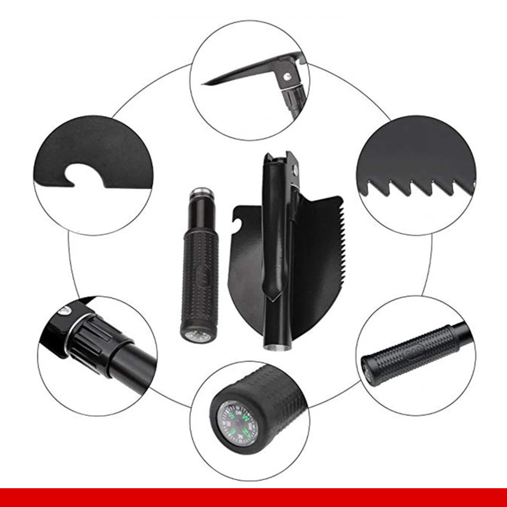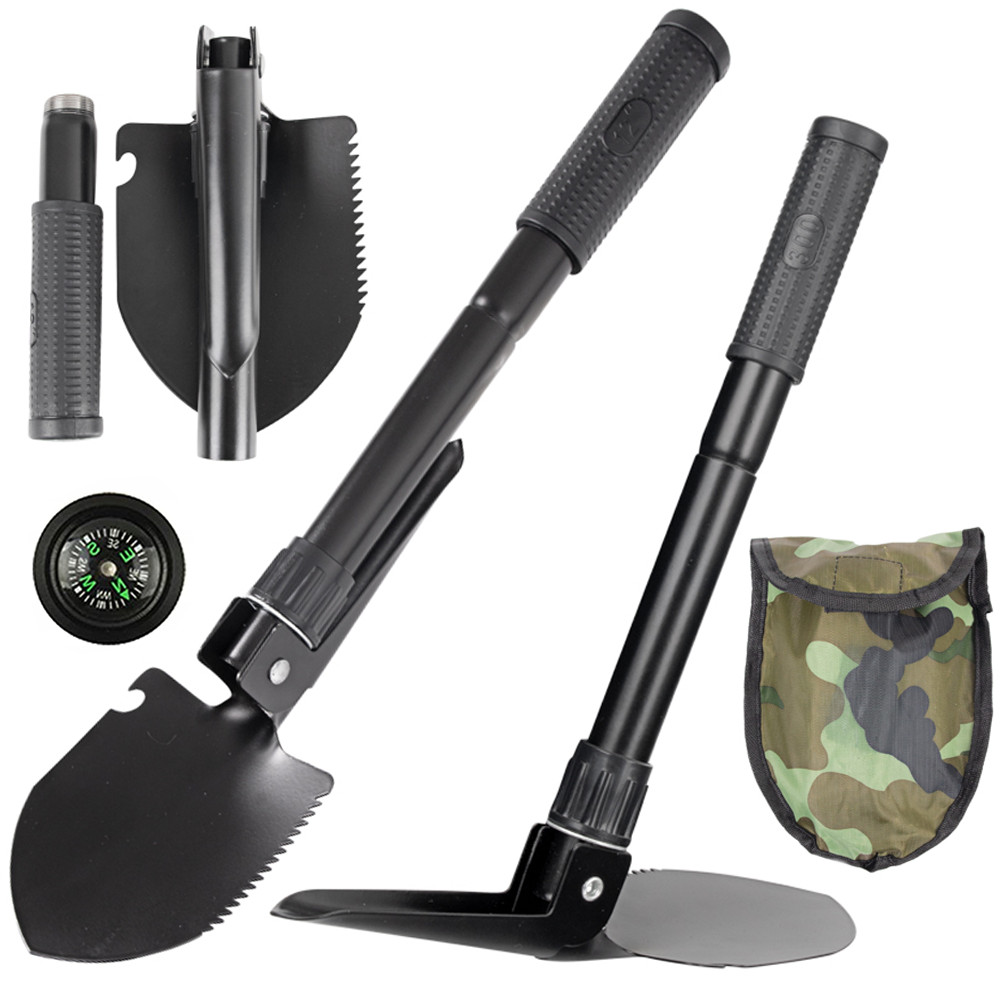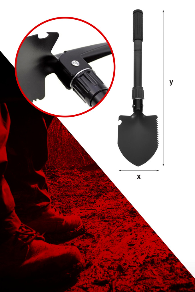 • 6 az 1-ben: lapát, csákány, kapa, fűrész, üveg-/konzervnyitó, iránytű