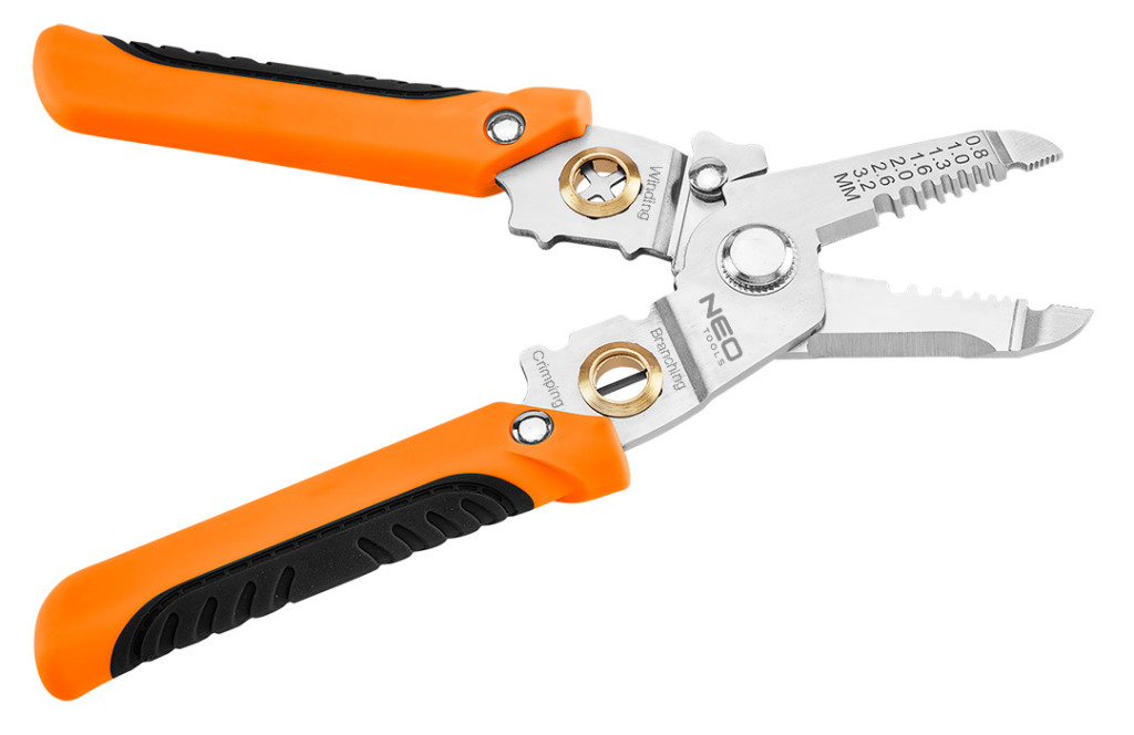 6 az 1-ben vezetékcsupaszító fogó, funkciók: szigetelés eltávolítása 0,8-tól 3,2 mm-ig, vezetékek vágása, krimpelő csatlakozók összecsavarása, vezetékek sodrása, vezetékek szétválasztása, vezetéktartó fogó, kétkomponensű nyél, 180 mm hosszú, nyitózár, nyitórugó, rozsdamentes acél