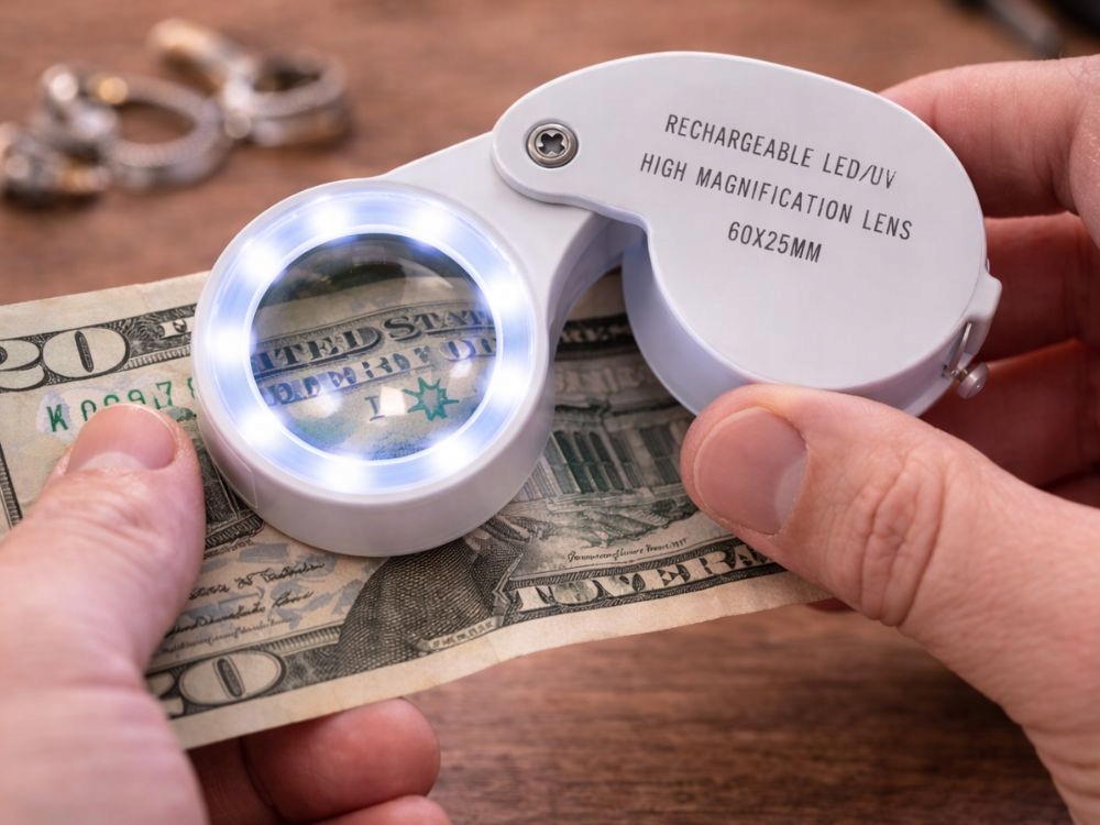 A nagyító kétféle háttérvilágítással rendelkezik: standard LED-es fény, amely gyenge megvilágítás mellett javítja a láthatóságot, valamint UV-fény, amely hasznos lehet olyan részletek vagy elemek ellenőrzéséhez, amelyek csak ultraibolya fényben láthatók.