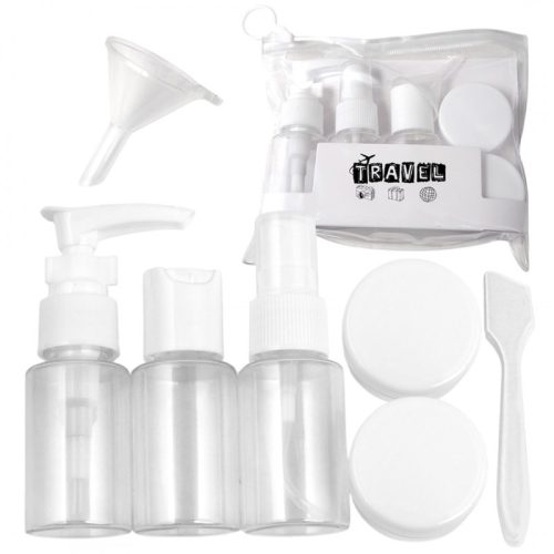 UTAZÓ PALACK KÉSZLET: 7 darabos flakon- és tartálykészlet, kifejezetten kozmetikumok utazás közbeni szállítására tervezve. Szorosan lezárt kialakításuknak köszönhetően megakadályozzák a véletlen kifolyást a bőröndben vagy utazótáskában. A készlet tartalma: - 1 db 30 ml-es flakon - 1 db 30 ml-es pumpás flakon - 1 db 30 ml-es szórófejes flakon - 2 db tégely - 1 db tölcsér - 1 db spatula. A készletet tartalmazó tasak mérete: 16 x 13,5 cm. Tömeg: 64 g.