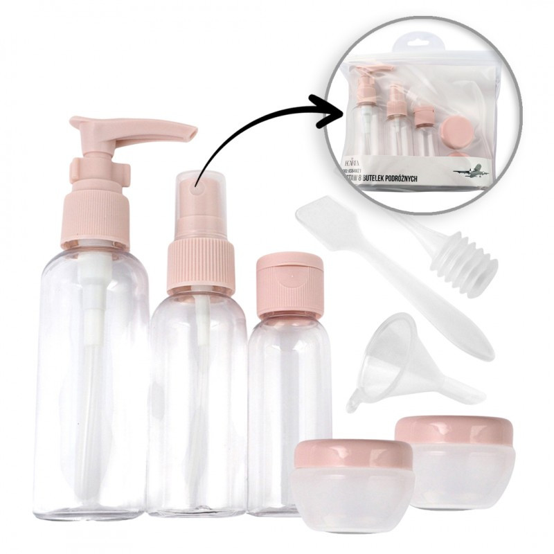 UTAZÓ PALACK KÉSZLET. Ez a 8 darabos palack- és tartálykészlet kifejezetten kozmetikumok utazás közbeni hordozására készült. Szorosan lezárt kialakításuknak köszönhetően megakadályozzák a véletlen kifolyást a bőröndben vagy utazótáskában. Méretek: Lásd az utolsó fotót.