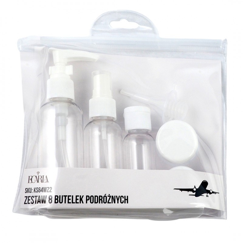 UTAZÓ PALACK KÉSZLET. Ez a 8 darabos palack- és tartálykészlet kifejezetten kozmetikumok utazás közbeni hordozására készült. Szorosan lezárt kialakításuknak köszönhetően megakadályozzák a véletlen kifolyást a bőröndben vagy utazótáskában. Méretek: Lásd az utolsó fotót.