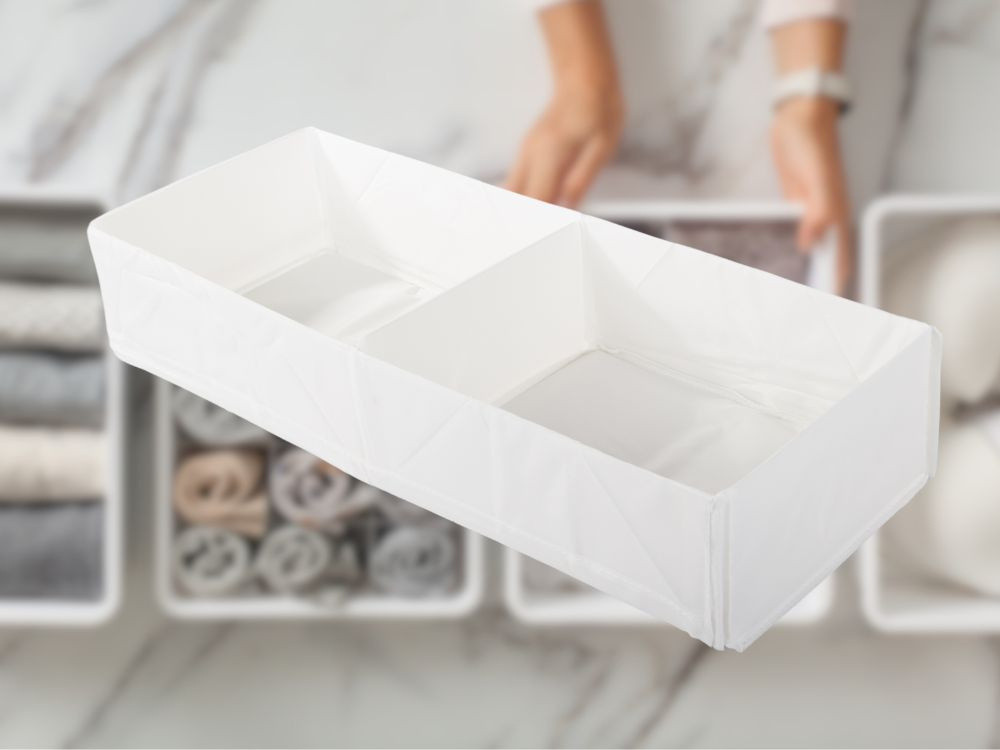 Állítson helyre rendet a szekrényében és fiókjaiban! Ez a praktikus, elválasztókkal ellátott szervező ideális megoldás fehérneműk, zoknik, törölközők vagy más kisebb ruhadarabok tárolására .