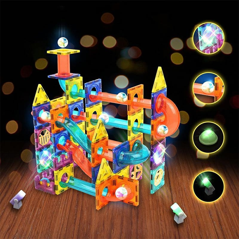 Mágneses kockákból álló készlet márványpálya építéséhez. A készlet egyes elemei beépített világítással rendelkeznek, így a játék sötétben is lenyűgözően mutat. A kockák lehetővé teszik bármilyen nehézségű építmény megépítését – az egyszerű formáktól az összetett háromdimenziós szerkezetekig. Márka: Egaleco Specifikációk Világító elemek tápegysége: LR1130x3 (tartozék) Elemek száma: 110 Csomag méretei: 38x30x10cm Ez a játék 3 év feletti gyermekek számára készült. A termék egy külön dobozban van csomagolva – szállításra készen. Darabszám raklaponként: 120