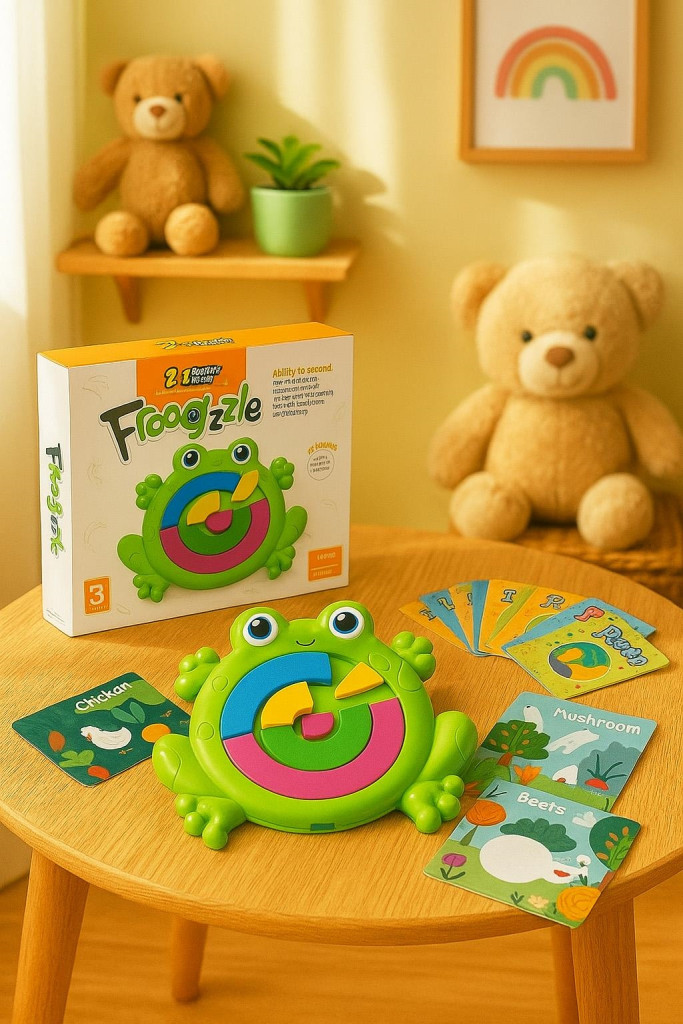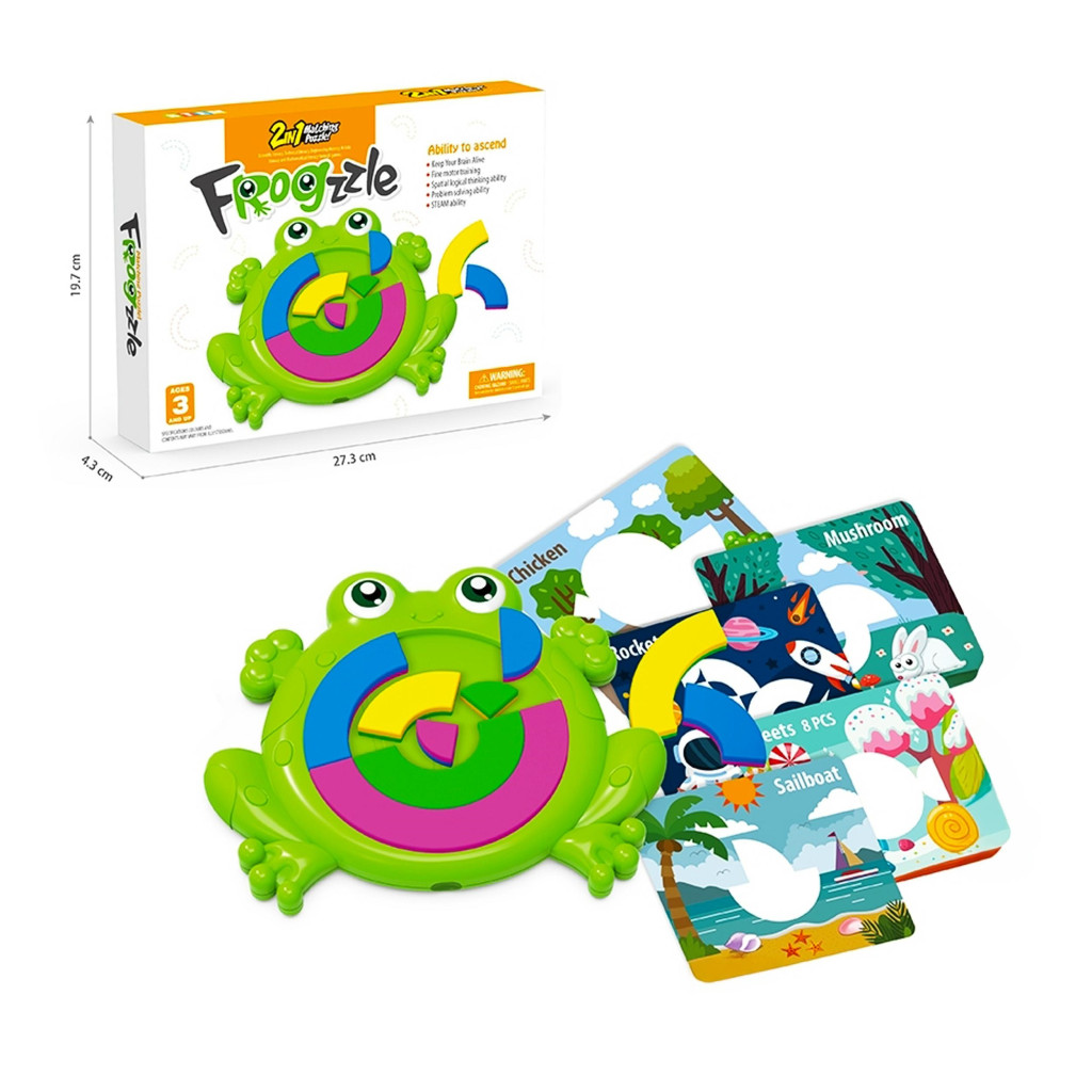 Egy oktató jellegű kirakós játék, amely fejleszti a megfigyelőkészséget, a kézügyességet és a problémamegoldó készséget. Tartalmaz 40 színes kihíváskártyát, egy béka alakú táblát színes gyűrűkkel minták létrehozásához, és kirakós sablonokat. A játék két játékmódot kínál, és ideális 3 éves vagy annál idősebb gyermekek számára, biztosítva a játékos tanulást. A KÉSZLET TARTALMA: • 18 kétoldalas kirakódarab különböző formákban • Egy béka alakú tároló • 40 kártya • 9 jelenetkártya 20x18cm Béka méretei: 22x20,5x2cm Csomagolás méretei: 27x20x4cm