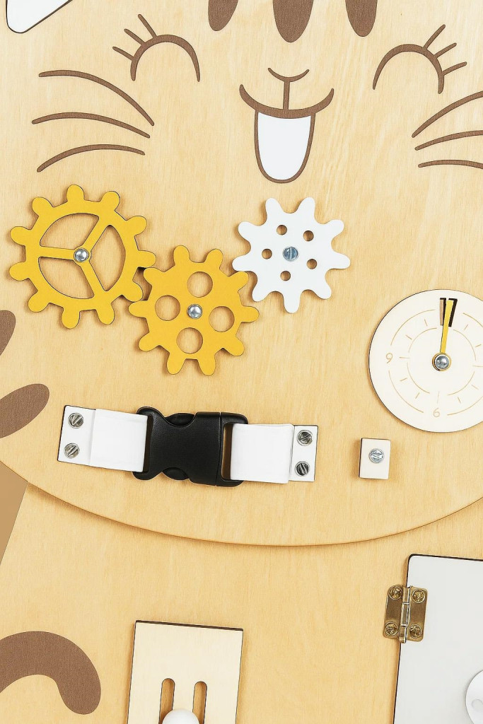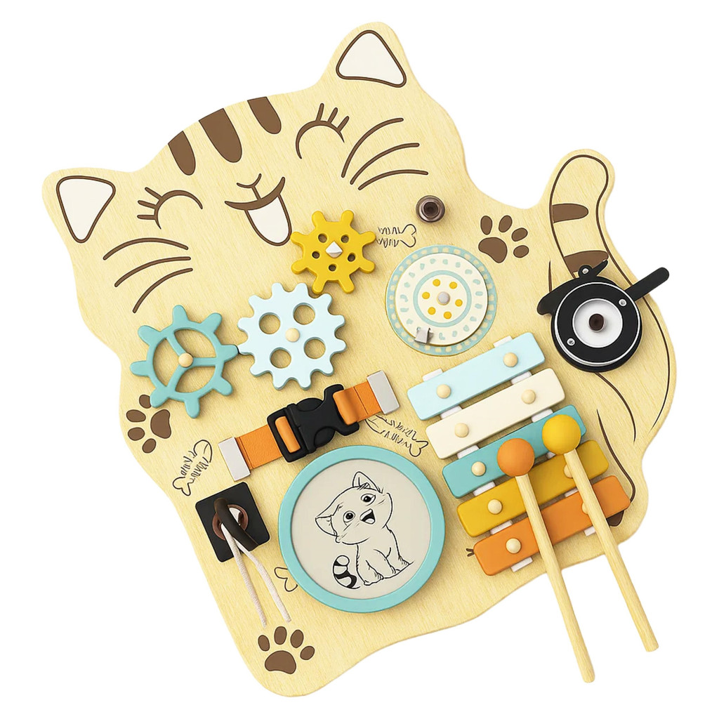 Ez a fából készült, macska alakú manipulációs tábla egy imádnivaló és funkcionális érzékszervi játék a kicsik számára.