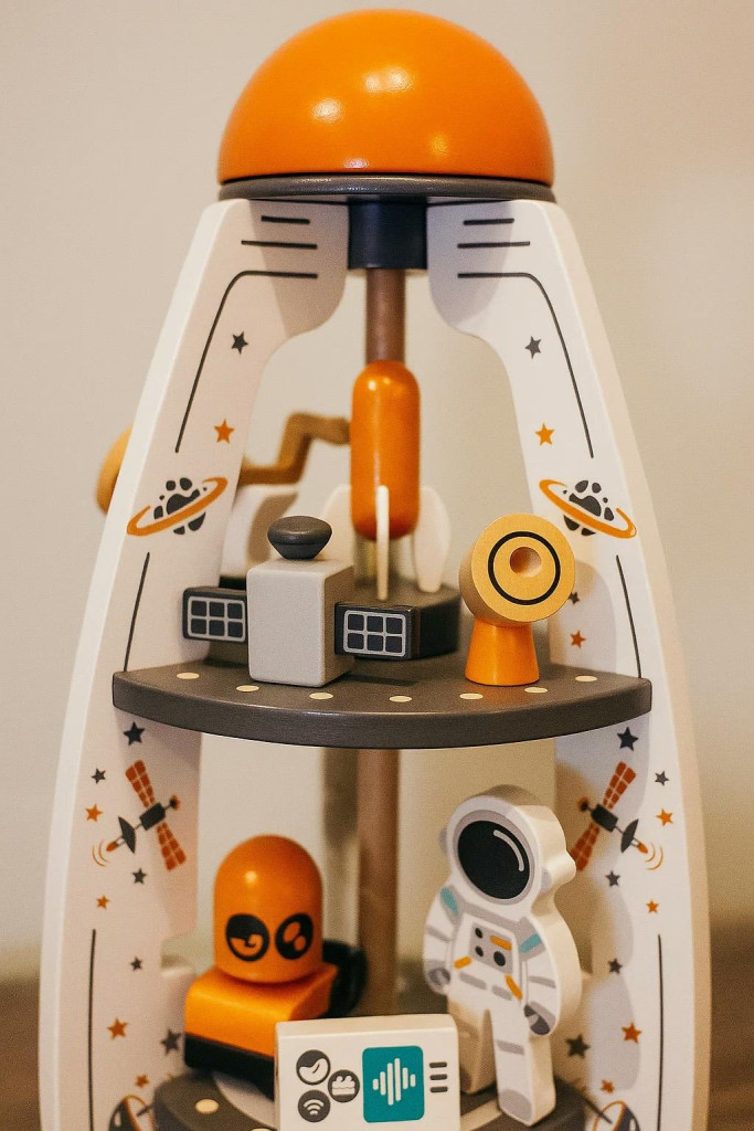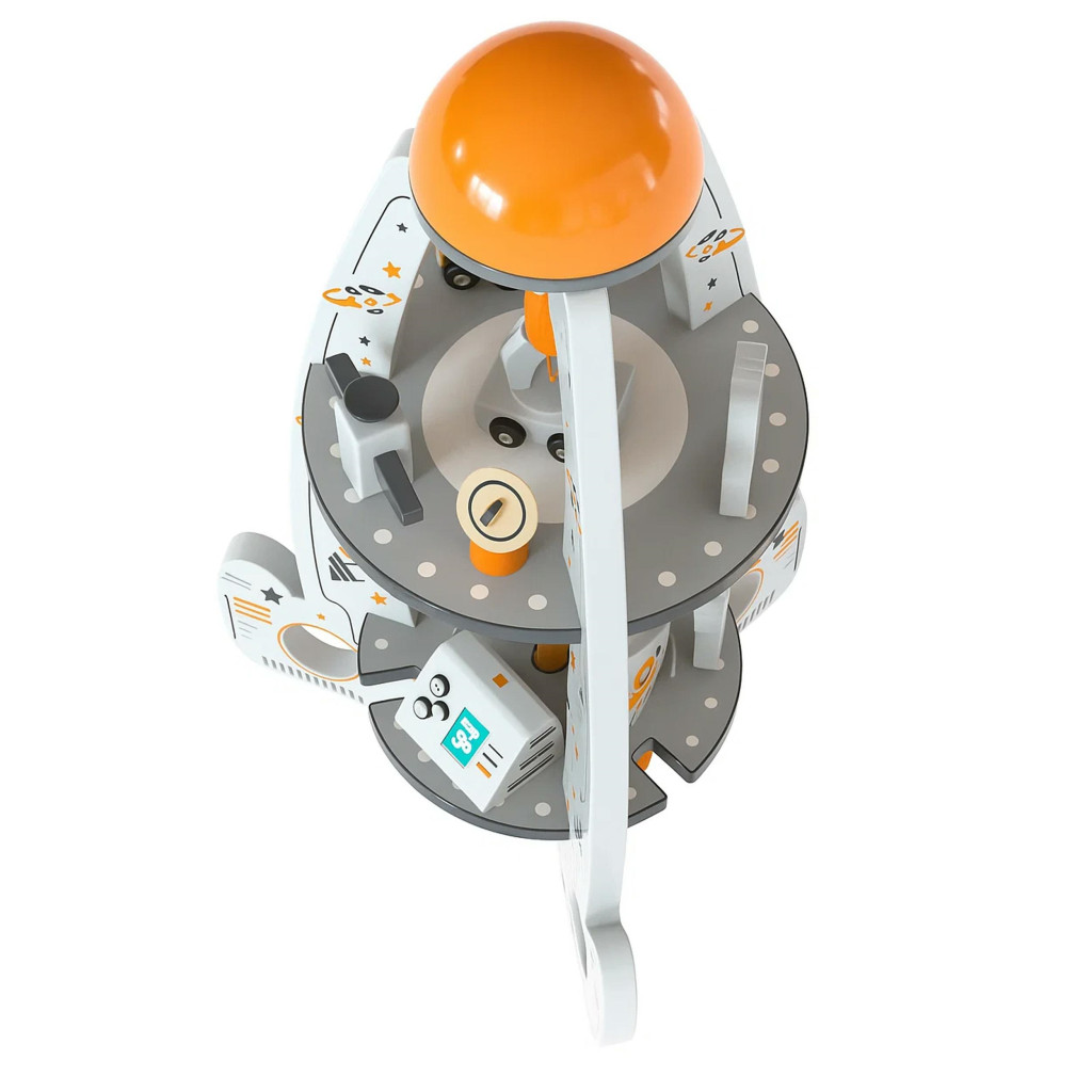Ez a fából készült űrrakéta egy érzékszervi játék, amely fejleszti a gyermekek kézügyességét és logikus gondolkodását. Fogaskerekekkel, abakusszal, motoros hurokkal és egyéb mozgó elemekkel felszerelve interaktív és fejlesztő játékot biztosít. Stabil felépítése és színes kidolgozása vonzó kiegészítője bármely gyermekszobának. Méretek: magasság 50cm, szélesség 30cm, alsó parkoló átmérője 10cm, középső szint átmérője 18cm, felső parkoló átmérője 21,5cm. A készlet tartalma: - 3 jármű - földönkívüli figura - rakéta - műhold - díszítőelemek. Csomag méretei: 49x24,5x8,5cm. Raklaponkénti mennyiség: 144 db.