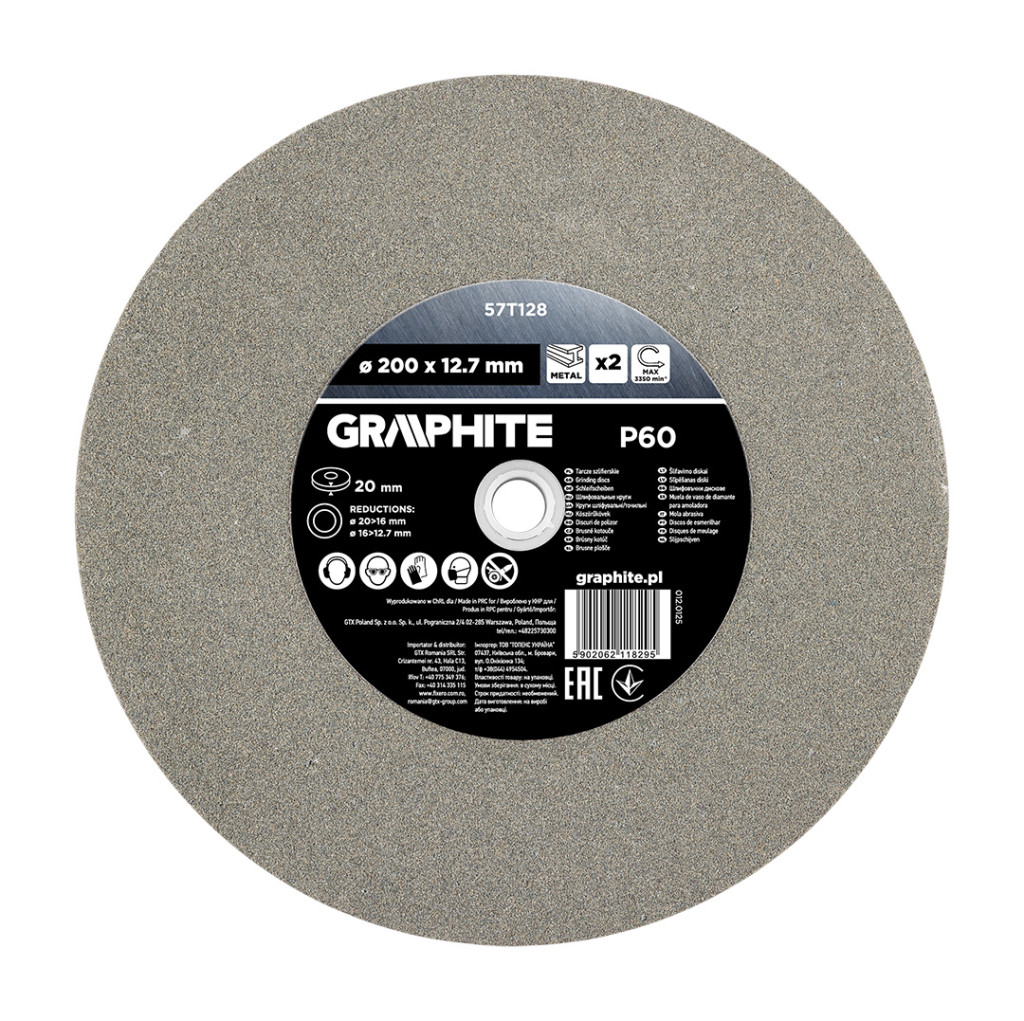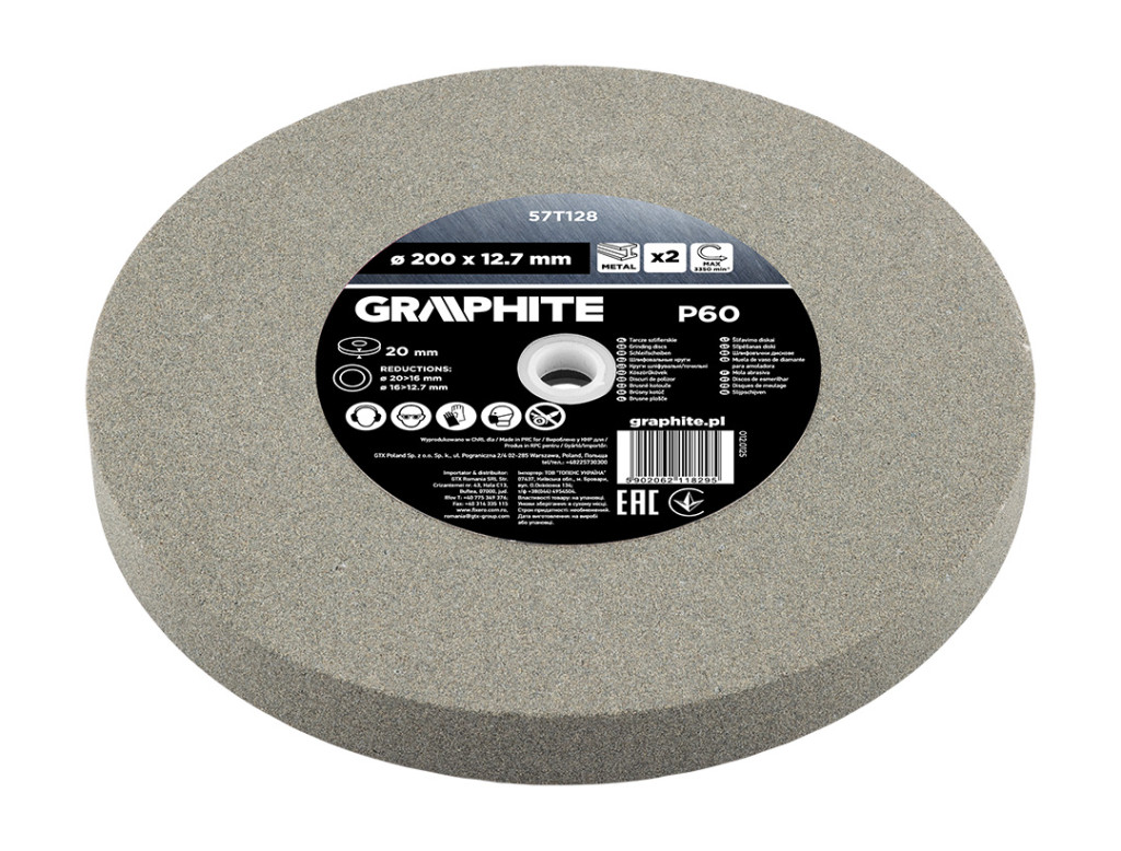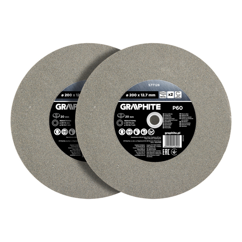 Csiszolókorongok 200 x 20/16/12,7 x 16 mm, szemcseméret P60, 2 db a készletben, külső átmérő 200 mm, a rögzítőfurat belső átmérője 12,7 mm, 20 > 16 és 16 > 12,7 mm-es szűkítőkkel, vastagság: 20 mm, maximális forgási sebesség 3350 ford/perc, alkalmazás: fém