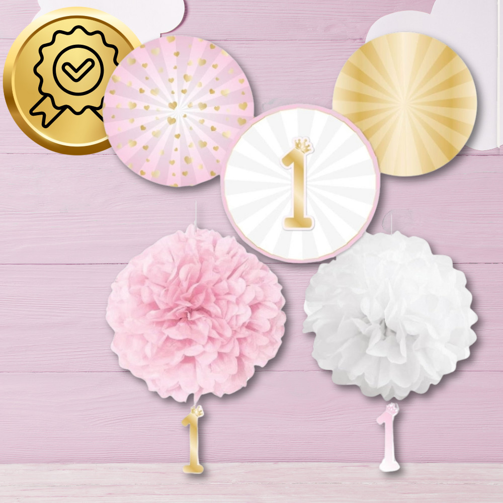 ✅Ünnepeld stílusosan az első születésnapodat ezzel a gyönyörű dekorációs készlettel. A készlet 5 darabot tartalmaz, köztük 40 cm-es és 30 cm-es pomponokat rózsaszín, fehér és arany színben. Tökéletes a parti helyszínének ünnepi díszítésére és varázslatos hangulat megteremtésére.