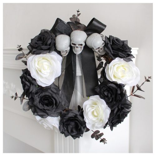 Dekoratív Halloween ajtó-/asztalkoszorú. Gyönyörűen kidolgozott és nagyon ijesztő Halloween koszorú. Tökéletes asztalra vagy ajtóra, dekoratív koponyáival és sötét színeivel karaktert kölcsönöz. Magasság: 35 cm, Szélesség: 35 cm, Mélység: 10 cm