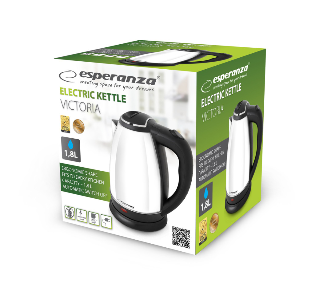 A modern és elegáns Esperanza VICTORIA vízforraló rozsdamentes acélból készült, több színben kapható, hogy bármilyen konyhához illeszkedjen. Ergonomikus formája és funkcionalitása a nap bármely szakában és bármilyen belső térben jól mutat. Kényelmes, beépített fűtőelemmel felszerelt. A vízforraló könnyen elhelyezhető az alapon. A hűvös tapintású fogantyú kényelmet és könnyű használatot biztosít.