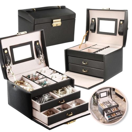 Egy nagyon funkcionális és elegáns ékszer- és óratok. Termékjellemzők: - Vadonatúj, kiváló minőségű termék. - Nem túl nagy, de nagyon funkcionális és átgondolt a kényelmes tárolás érdekében. - Masszív fémzárral és kulccsal záródik. Megfelelő védelmet nyújt gyűjteményének. - Elegáns, lakkozott anyaggal, úgynevezett ökológikus bőrrel borítva. - A belseje puha plüss béléssel rendelkezik. - Ez a doboz ideális ajándék. Rendkívül praktikus. - EGYEDI DIZÁJN - tökéletes minden nő számára - rekeszekkel rendelkezik gyűrűk, fülbevalók, nyakláncok és sok más számára. Ezenkívül egy fiókkal is rendelkezik a legdrágább értéktárgyaid számára. Méretek: 17 x 13,7 x 12 cm. Súly dobozzal: 740 g. A doboz dobozban van csomagolva.