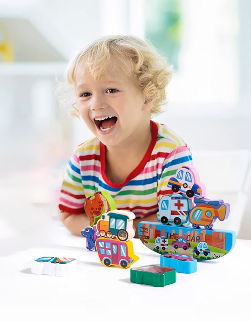 Ez az oktató jellegű fa egyensúlyozó kockákból álló készlet a tökéletes játék gyermeked számára. Az utcai autók formájú, bátorító formák élvezetté teszik a tanulást. A szórakozás és a kézügyesség fejlesztése itt kéz a kézben jár. Ennek a terméknek köszönhetően gyermeked fejleszteni fogja képzelőerejét, motorikus készségeit és koncentrációját.