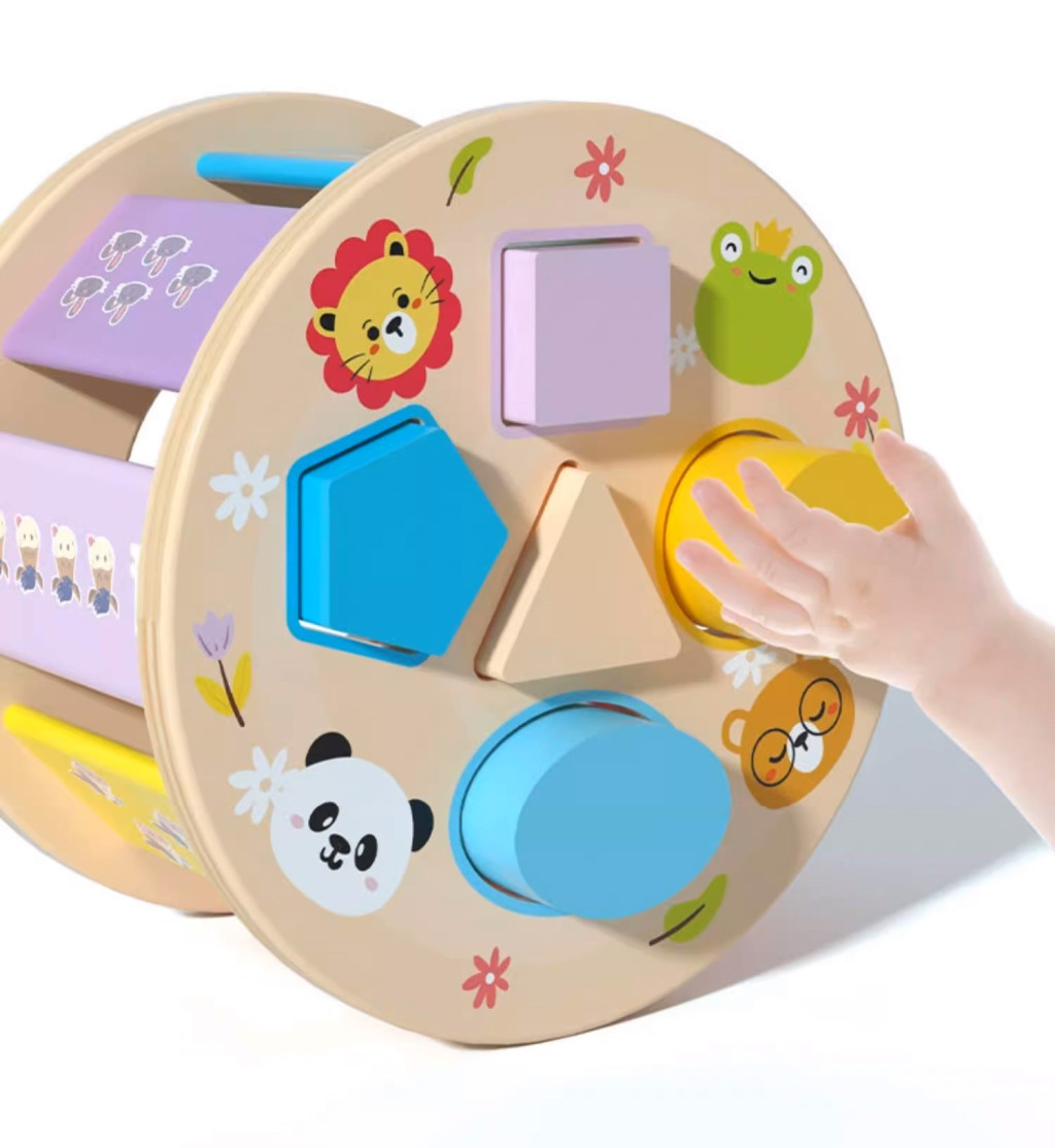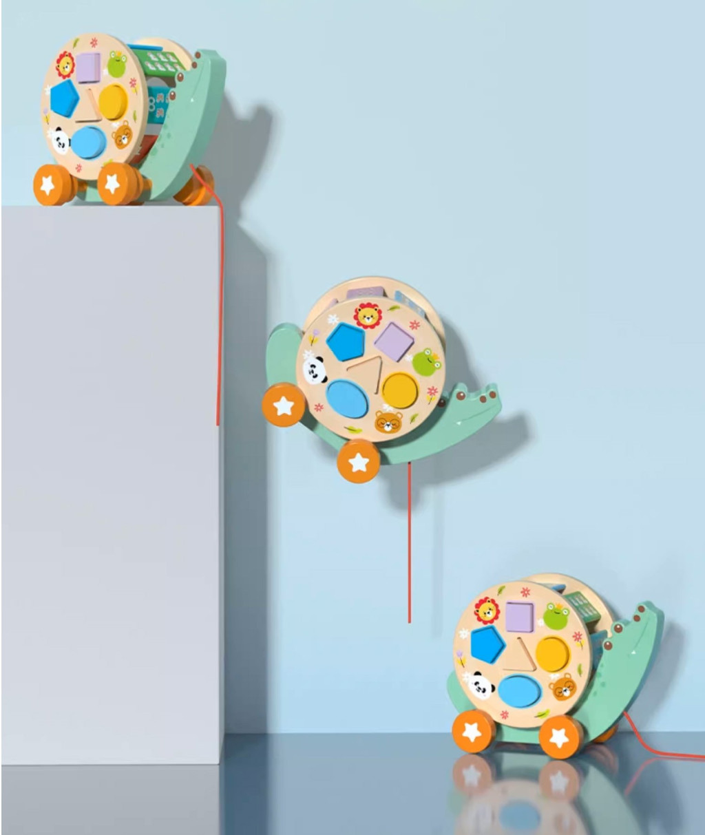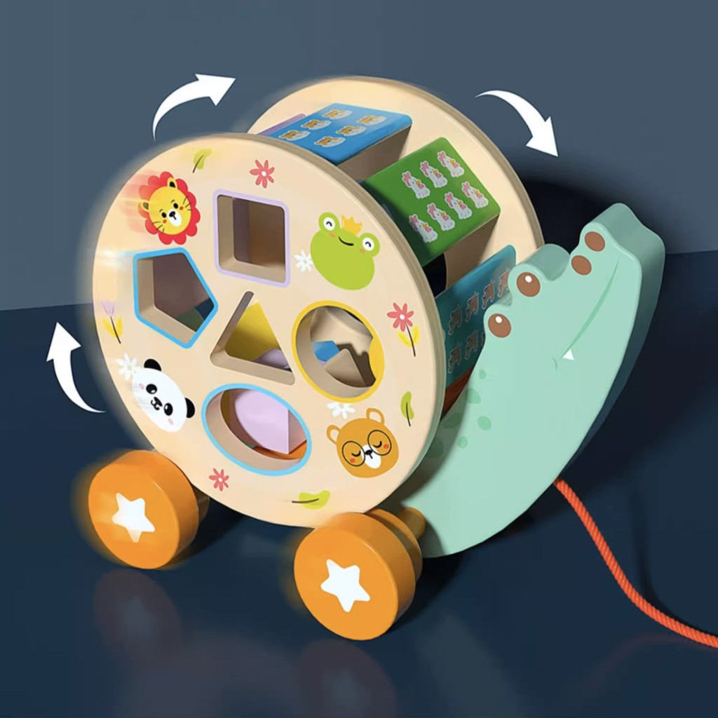 A készlet különféle formablokkokat tartalmaz, amelyeket gyermekednek a krokodilkerék "hátulján" található megfelelő lyukakhoz kell illesztenie. Játék közben gyermeked fejleszti motoros készségeit, kéz-szem koordinációját és logikus gondolkodását. Ráadásul, amikor meghúzod a játékot, a henger forog, ami még szórakoztatóbb lesz.