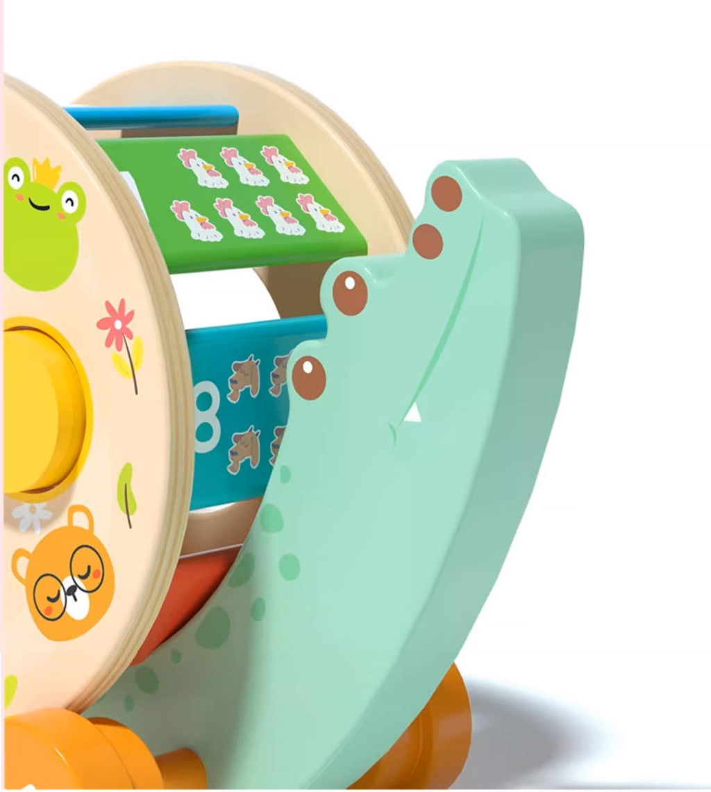 Amikor meghúzod a játékot, a kerék forog a kerekeken, lehetővé téve a krokodil számára, hogy könnyen mozogjon a padlón, ami tovább serkenti a motoros fejlődést és erősíti a kicsi izmait.