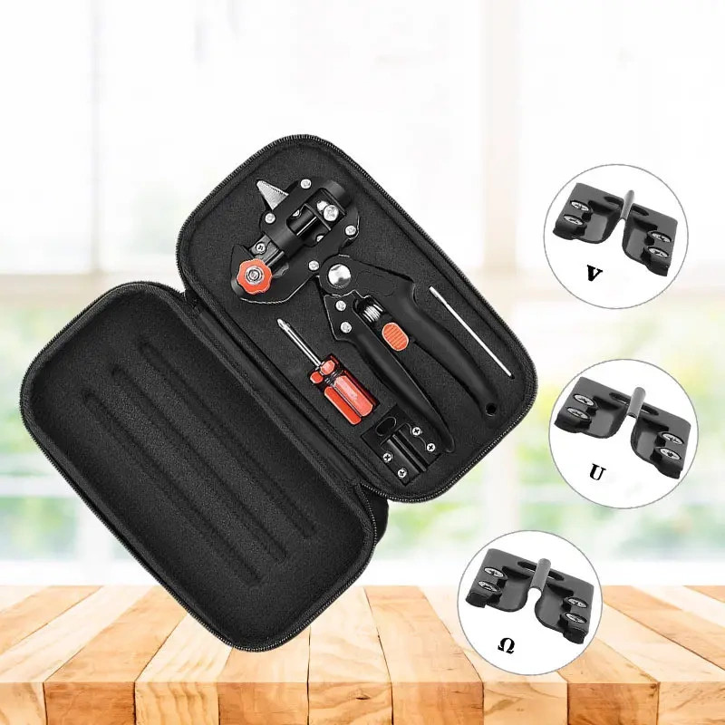 A készlet nemcsak a metszőollót tartalmazza, hanem az oltószalagot, az alátétet, a 3 menetvezetőt, a kezelőszerszámokat és a masszív tokot is, így teljes megoldást kínál.