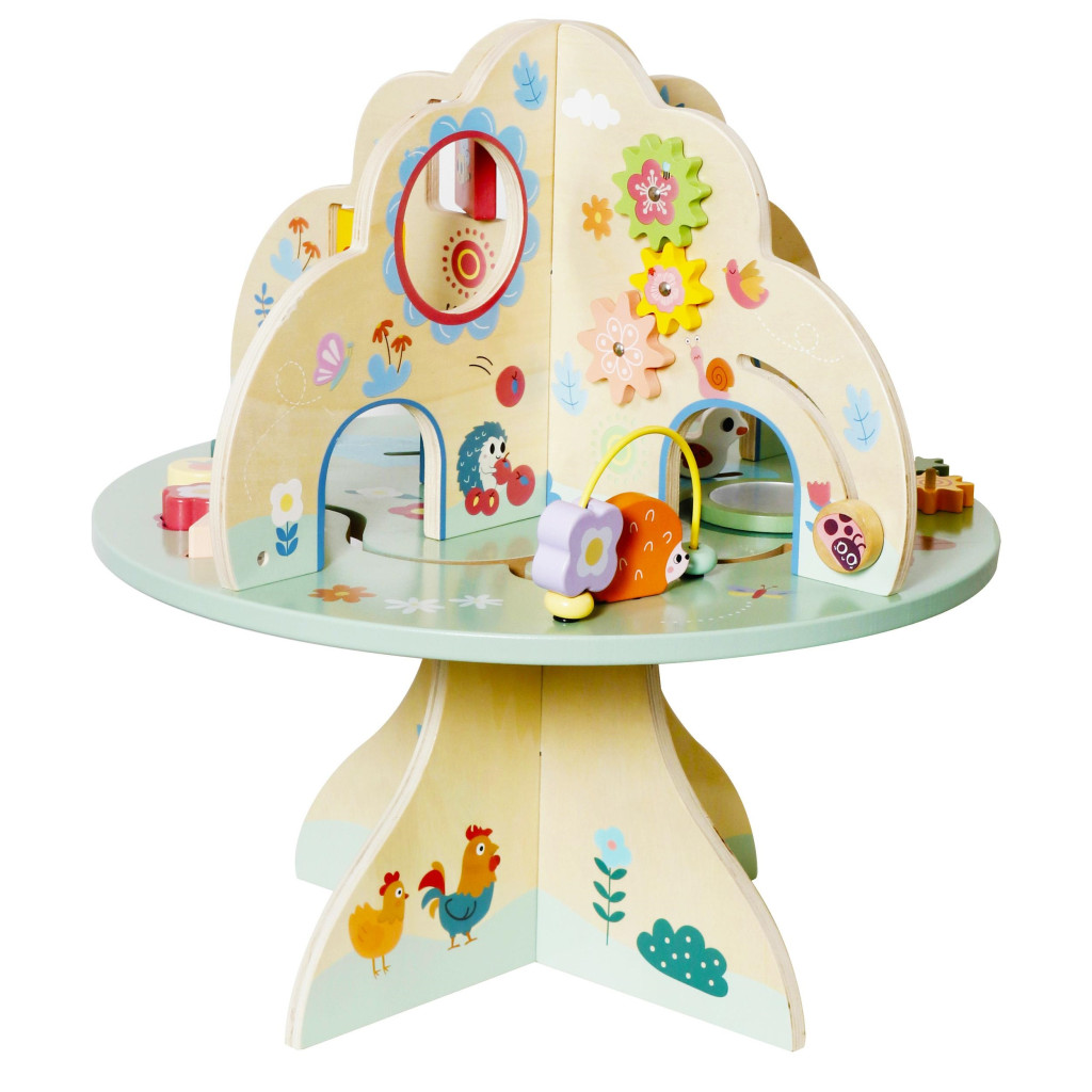 A változatos tevékenységeknek köszönhetően – a színes fogaskerekektől és az abakusztól kezdve a motoros hurkokon át a csúszó elemekig – az asztal fejleszti a gyermek kézügyességét, koordinációját és logikus gondolkodását.
