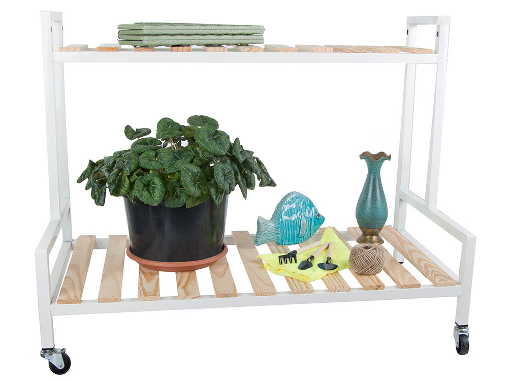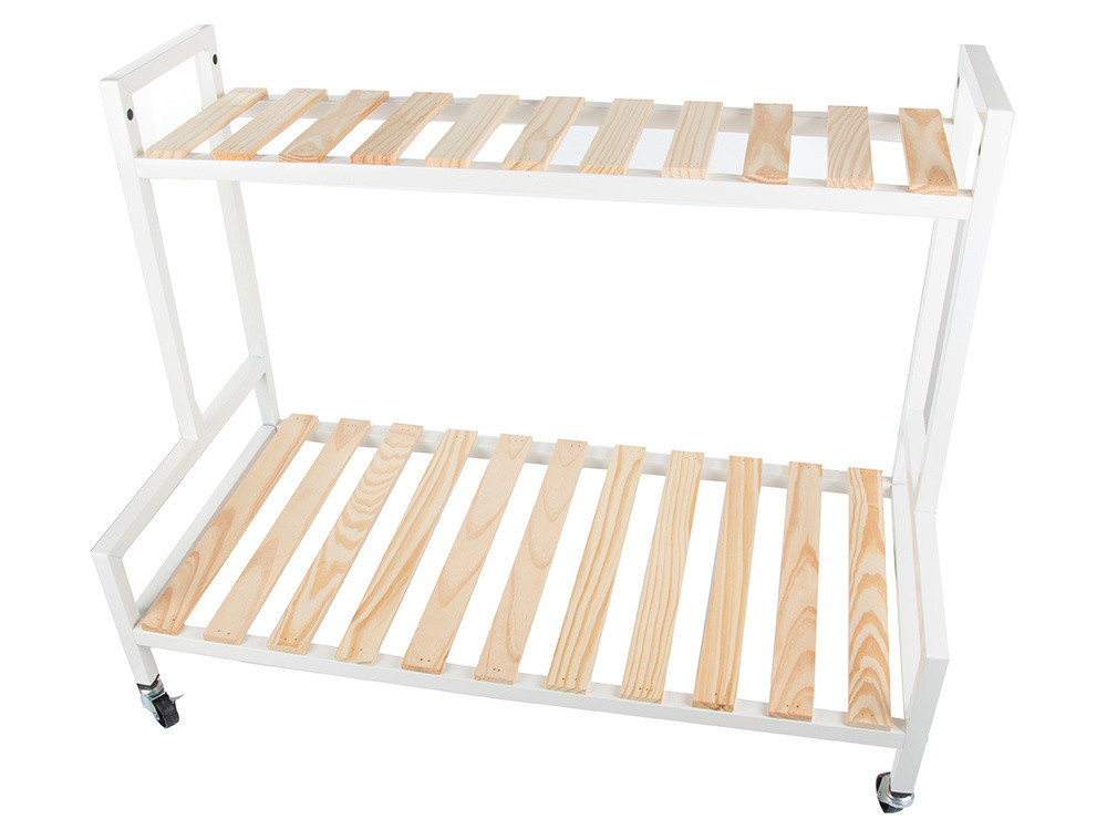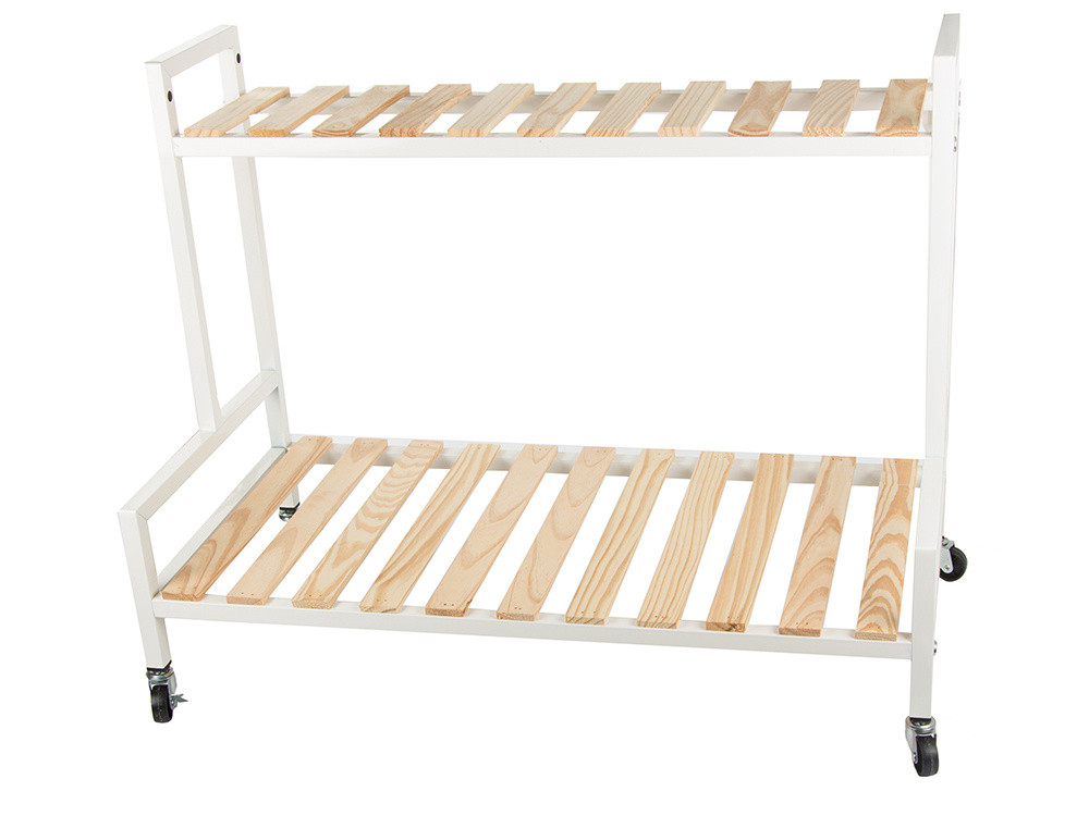 FÁBÓL KÉSZÜLT VIRÁGCSERÉP KÉTSZINTES POLC KEREKEKEN TERASZ