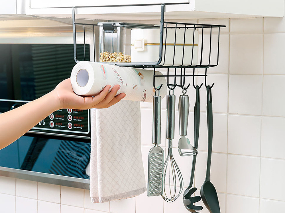 A speciális kampós fogantyúknak köszönhetően a szervező stabilan tart a polc alatt anélkül, hogy elmozdulna vagy meginogna. Az alján található további kampók lehetővé teszik különböző tárgyak, például konyharuhák, főzési kiegészítők vagy kanalak felakasztását.