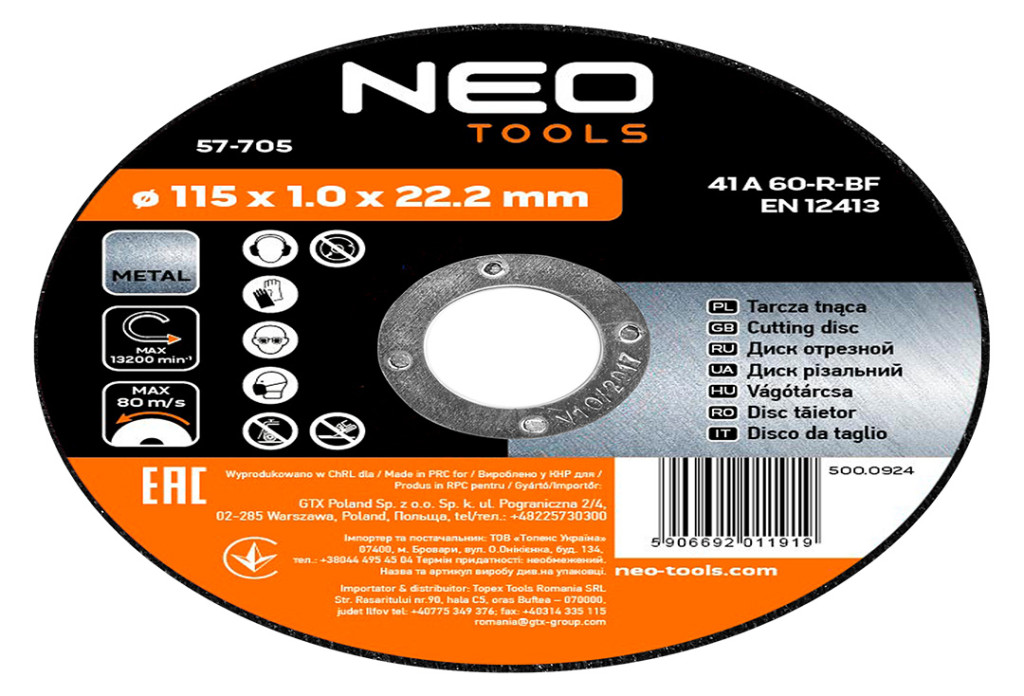 Fémvágó tárcsa, átmérő 115 mm, vastagság 1 mm, rögzítőfurat átmérője 22,2 mm, 41 A60-R-BF, EN12413, fémhez, maximális fordulatszám 13 200 ford/perc, 80 m/s, 10 db.