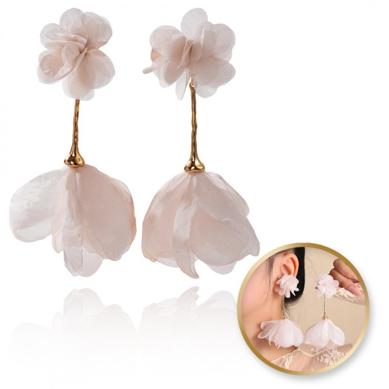 Műtüll virág fülbevalók. Gyönyörűen kiegészítik mind az elegáns öltözéket, mind a mindennapi viseletet. Zár: akasztó. Méretek: 11cm x 5cm. Csomagolás méretei: 16,5cm x 9cm. Súly: 10g nettó / 13g bruttó. Antiallergén ékszer, nikkel- és krómmentes. Ne áztassa! Kerülje a vízzel való érintkezést! Így nagyon sokáig fog tartani!