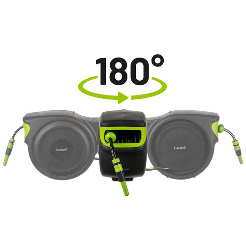 teljes öntözőkészlet – mindent megkapsz, amire szükséged van: automatikus orsó, 25 m tömlő, 7 funkciós pisztoly, fúvókák, csatlakozók, 180°-ban elforgatható fali konzol és még egy 2 m-es ellátótömlő is