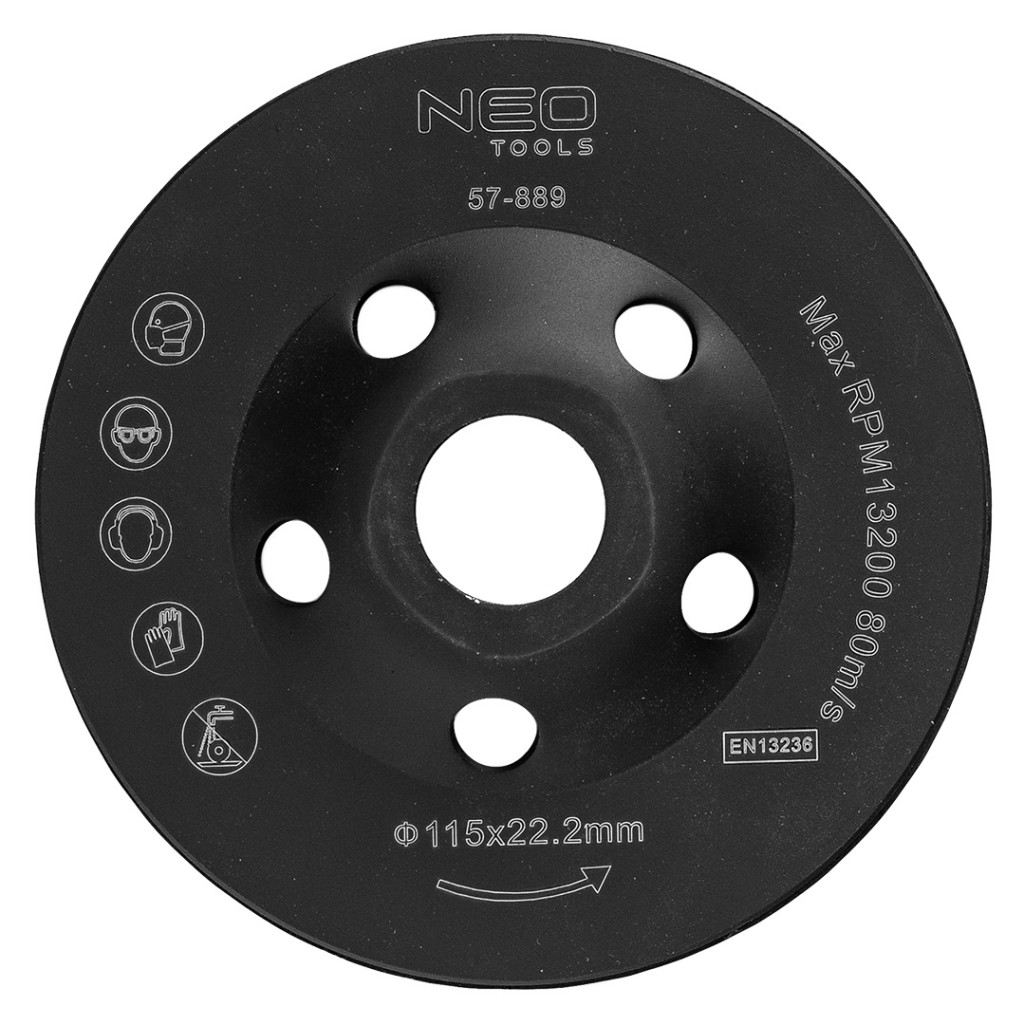 Gyémánt csiszolótárcsa, turbó, átmérő 115 mm, rögzítőfurat átmérő 22,2 mm, szegmens szélessége 20 mm, szegmens magassága 5 mm, maximális sebesség 13 200 ford/perc, 80 m/s, száraz csiszoláshoz, EN 13236 szabvány, betonhoz