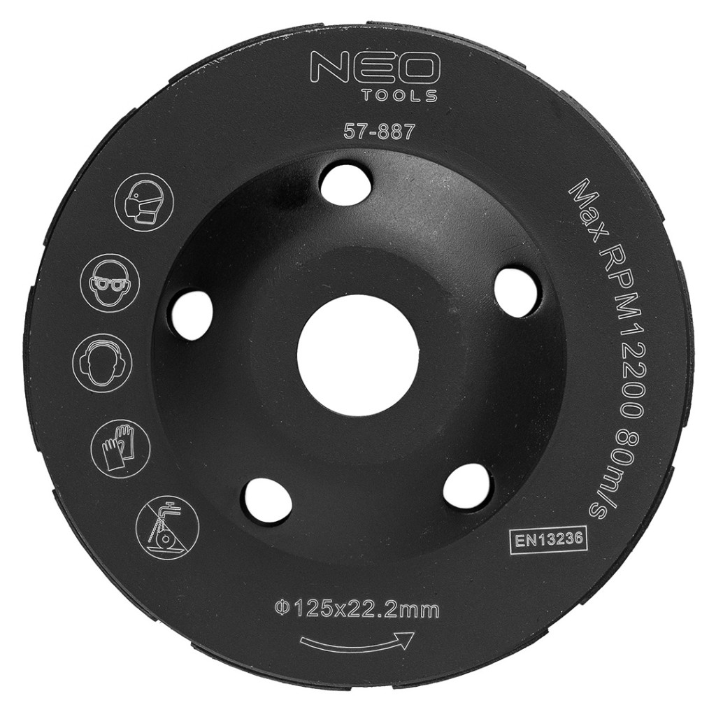 Gyémánt csiszolókorong, dupla szegmensű, átmérő 125 mm, rögzítőfurat átmérője 22,2 mm, szegmens szélessége 8 mm, szegmens magassága 5 mm, maximális sebesség 12 200 ford/perc, 80 m/s, száraz csiszoláshoz, EN 13236 szabvány, betonhoz