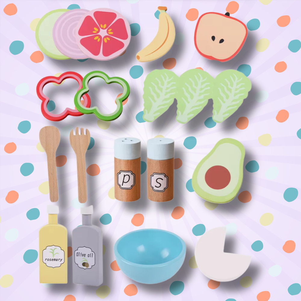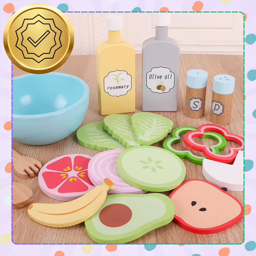 ☘️Fedezd fel ezt a csodálatos, fából készült zöldségkészletet gyerekeknek, amely ötvözi a szórakozást az egészséges étkezésről való tanulással! A készlet különféle gyümölcsöket, evőeszközöket és kiegészítőket tartalmaz, így gyermeked saját színes gyümölcssalátákat készíthet, miközben elsajátítja az egészséges életmód alapelveit. Ez a tökéletes játék, amely támogatja a kreativitást, fejleszti a kézügyességet és bevezeti a kicsiket a kulináris kísérletek világába.