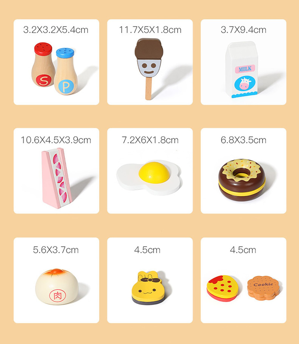 1. Reális megjelenés: A készletben található reggeli elemek és sütik valóságosnak tűnnek, így gyermeke utánozhatja a vágási mozdulatokat, és megtanulhatja felismerni a különböző formákat és színeket.