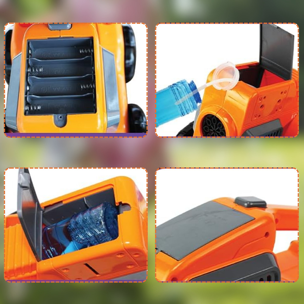 A folyadék behelyezése nagyon egyszerű - helyezze a szívócső végét a folyadékkal teli palackba, amíg az be nem illeszkedik eléri az alját, majd helyezd a palackot a játékba. Nyomd meg a gombot, és KÉSZ! Színes buborékok repülnek ki a fűnyíró elején.