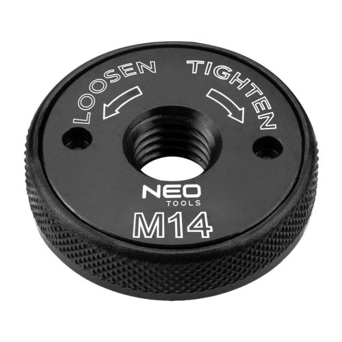 Gyorsrögzítő anya sarokcsiszolóhoz, M14 menet, magasság 13 mm, szélesség 46 mm, recézett oldalak, min. korongvastagság: 1 mm, korongátmérő-tartomány: 115 - 230 mm, beépített furatok standard csiszolókulcshoz