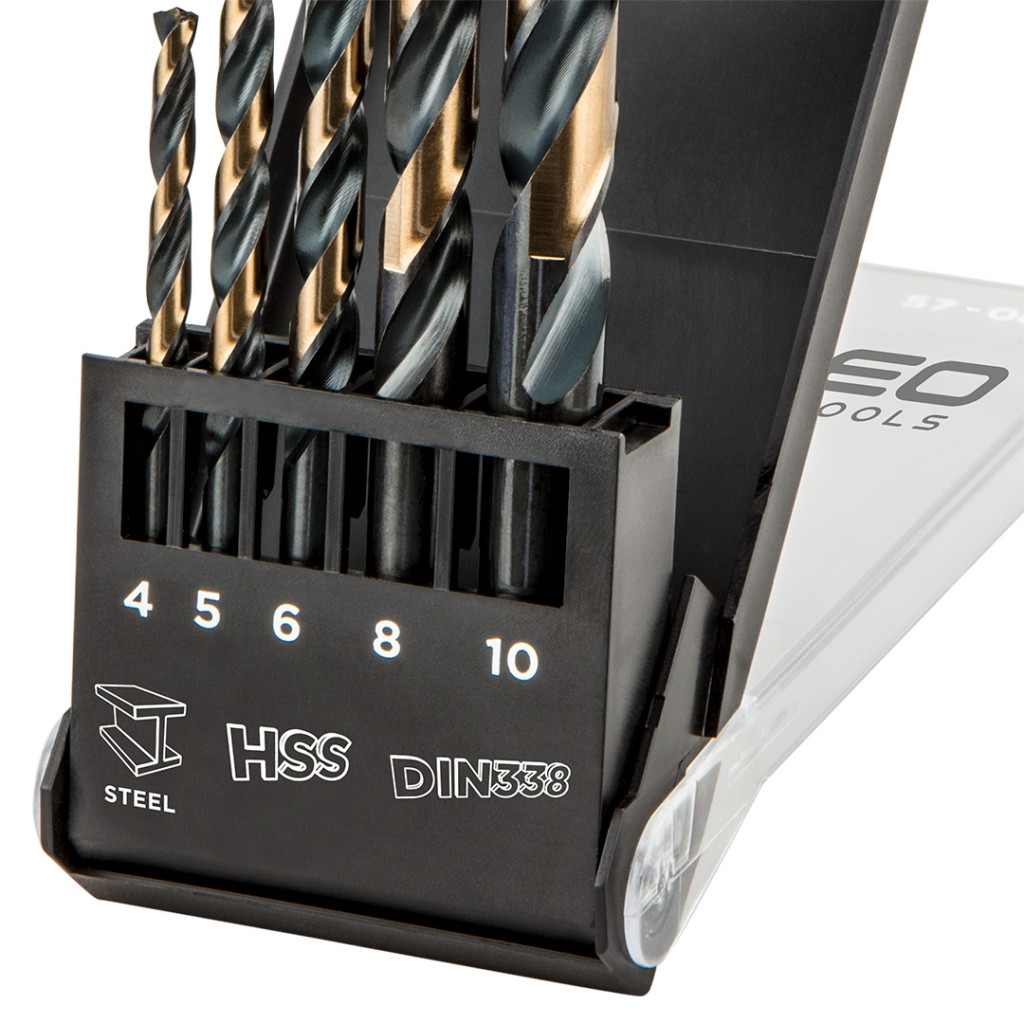 HSS-CNC fémfúrók, átmérők: 4, 5, 6, 8, 10 mm, mélyen köszörült, anyag: M2 acél, csúcsszög: 124°, letöréskorrekció: E, DIN338, munkahossz: 4: 43 mm, 5: 52 mm, 6: 57 mm, 8: 75 mm, 10: 87 mm, teljes hossz: 4: 75 mm, 5: 86 mm, 6: 93 mm, 8: 117 mm, 10: 133 mm, maximális fordulatszám: 4: 1800 ford/perc, 5: 1500 ford/perc, 6: 1300 ford/perc, 8: 1000 ford/perc, 10: 800 ford/perc, 5 darabos készlet