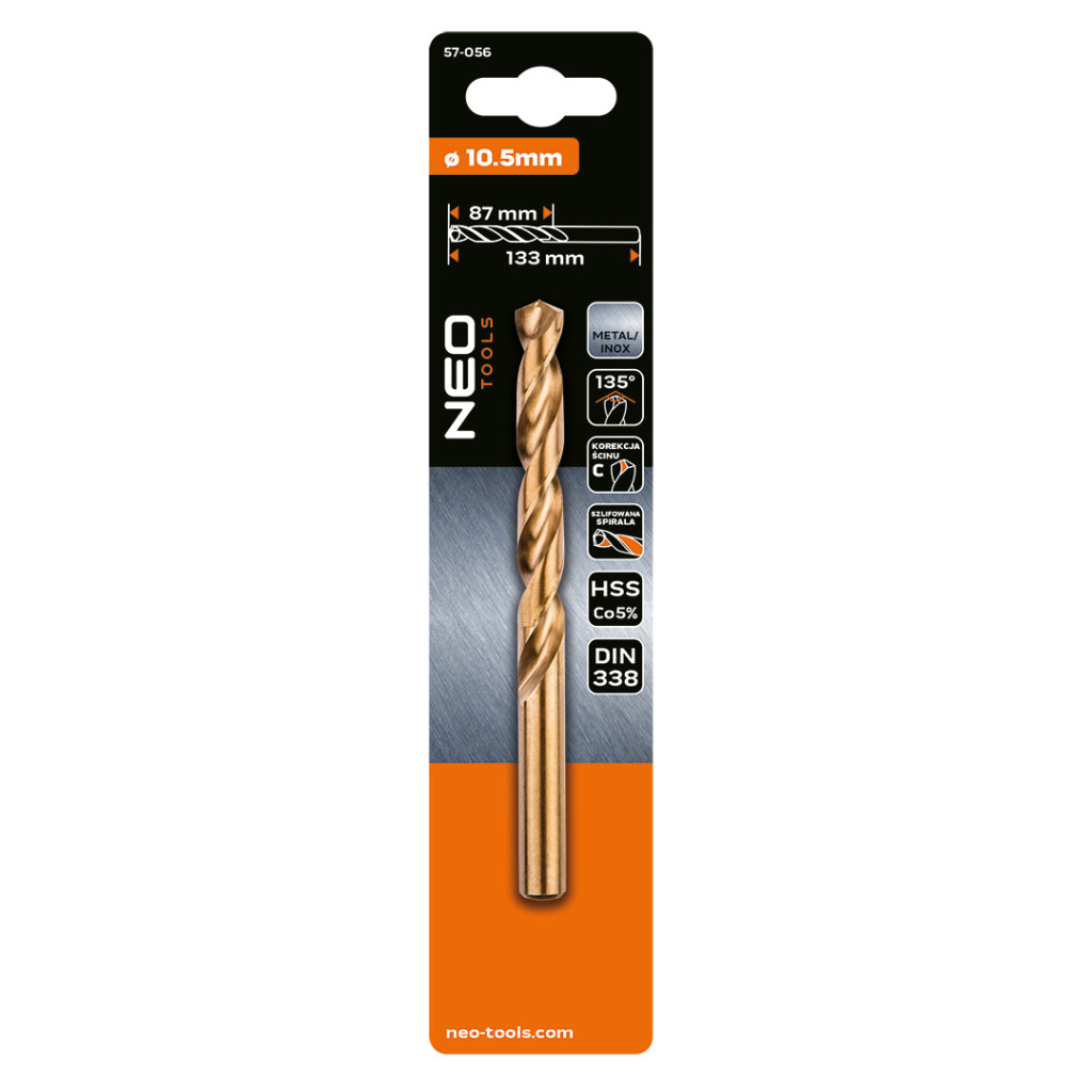 HSS-Co fémfúró, átmérő 10,5 mm, mélyen köszörült, anyaga M35 acél, csúcsszög 135°, letöréskorrekció C, DIN338, munkadarab hossza 87 mm, teljes hossz 133 mm, maximális forgási sebesség INOX 350-375 ford/perc, fém 700-750 ford/perc.