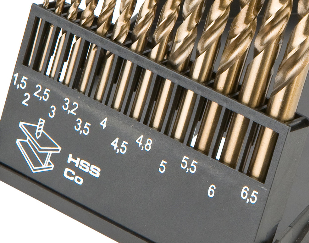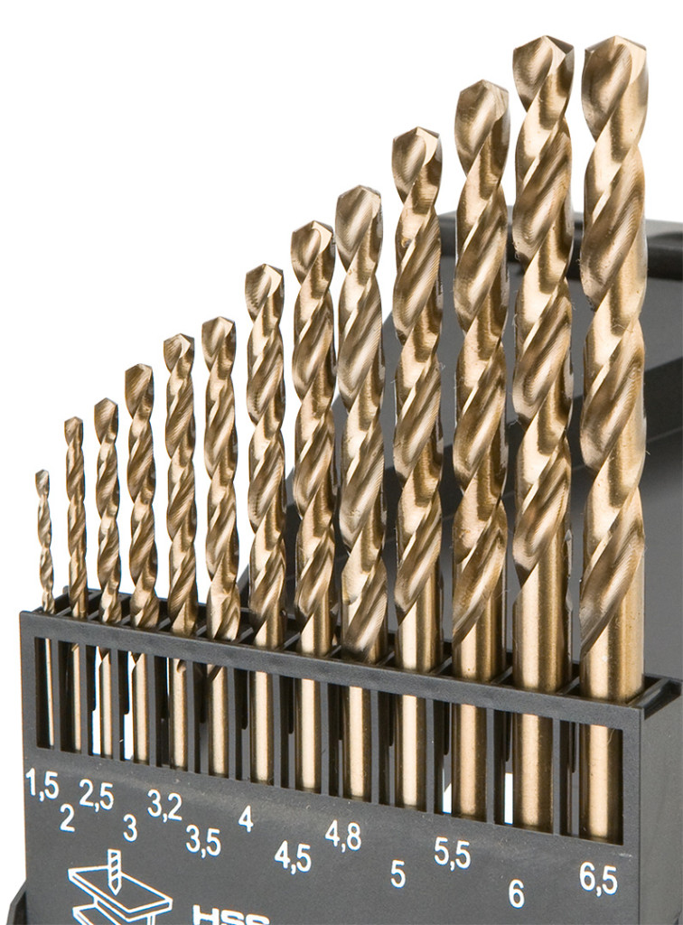 HSS-Co fémfúrók, átmérők: 1,5, 2, 2,5, 3, 3,2, 3,5, 4, 4,2, 4,8, 5, 5,5, 6, 6,5 mm, mélyen köszörült, anyag: M2 acél, csúcsszög 135°, letöréskorrekció C, DIN338, munkahossz: 1,5: 18 mm, 2: 24 mm, 2,5: 30 mm, 3: 33 mm, 3,2: 36 mm, 3,5: 39 mm, 4: 43 mm, 4,2: 43 mm, 4,8: 52 mm, 5: 52 mm, 5,5: 57 mm, 6: 57 mm, 6,5: 63 mm, teljes hossz: 1,5: 40 mm, 2: 46 mm, 2,5: 57 mm, 3: 61 mm, 3,2: 65 mm, 3,5: 70 mm, 4: 75 mm, 4,2: 75 mm, 4,8: 86 mm, 5: 86 mm, 5,5: 93 mm, 6: 93 mm, 6,5: 101 mm, maximális forgási sebesség INOX 1,5: 1275-1900 ford/perc, 2: 1825-2000 ford/perc, 2,5: 1450-1600 ford/perc, 3: 1225-1325 ford/perc, 3,2: 1150-1250 ford/perc, 3,5: 1050-1150 ford/perc, 4: 925-1000 ford/perc, 4,2: 875-950 ford/perc, 4,8: 750-825 ford/perc, 5: 725-800 fordulat/perc, 5,5: 675-725 fordulat/perc, 6: 600-650 fordulat/perc, 6,5: 575-625 fordulat/perc, fém 1,5: 2550-3800 fordulat/perc, 2: 3650-4000 fordulat/perc, 2,5: 2900-3200 fordulat/perc, 3: 2450-2650 fordulat/perc, 3,2: 2300-2500 fordulat/perc, 3,5: 2100-2300 fordulat/perc, 4: 1850-2000 fordulat/perc, 4,2: 1750-1900 fordulat/perc, 4,8: 1500-1650 fordulat/perc, 5: 1450-1600 fordulat/perc, 5,5: 1350-1450 fordulat/perc, 6: 1200-1300 fordulat/perc, 6,5: 1150-1250 fordulat/perc, 13 darabos készlet