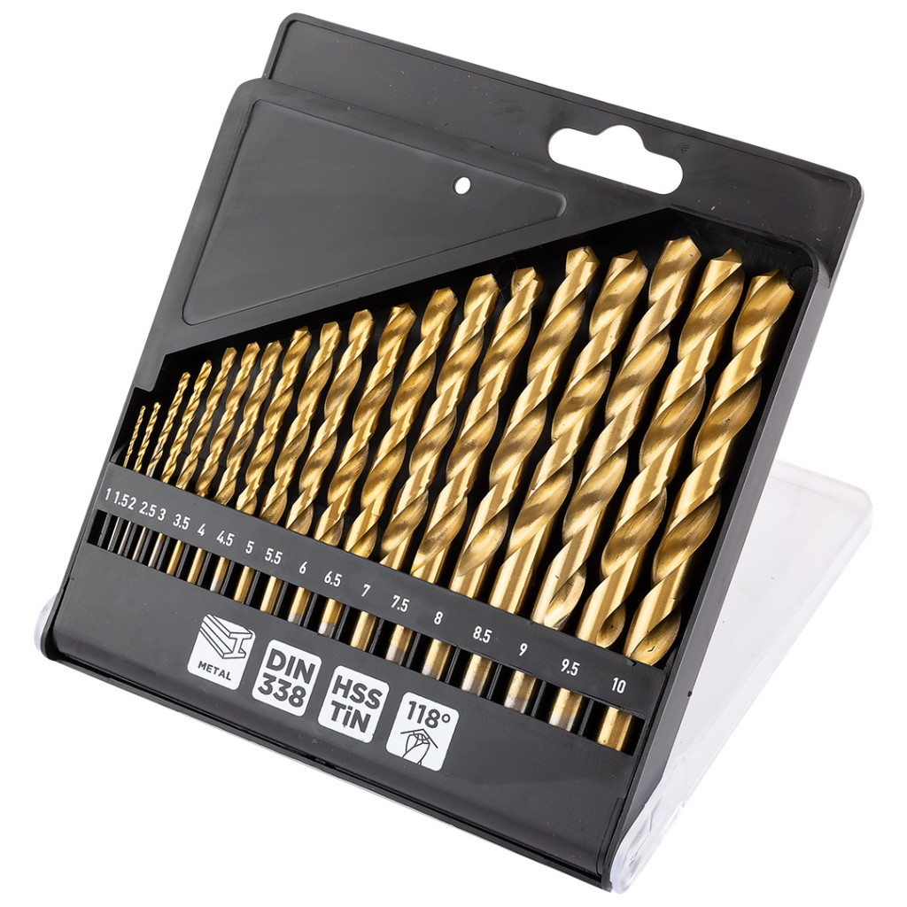 19 darabos fémfúró készlet, átmérők: 1; 1,5; 2; 2,5; 3; 3,5; 4; 4,5; 5; 5,5; 6; 6,5; 7; 7,5; 8; 8,5; 9; 9,5; 10 mm, HSS gyorsacélból készült, TiN bevonatú, hengeres szárral, 118°-os fúróélezési szöggel, megfelel a DIN 338 szabványnak, alkalmazás: fém.