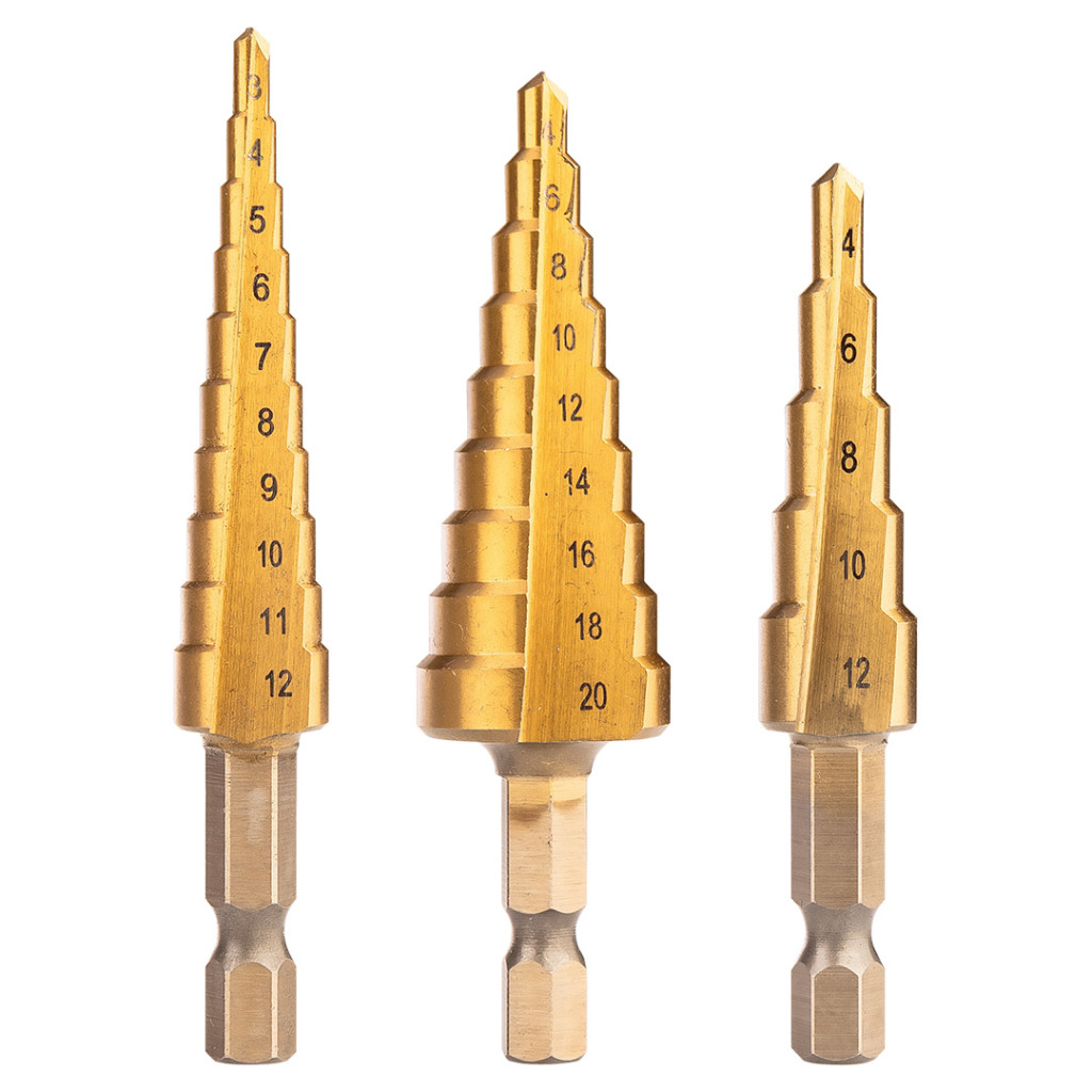 Három darabos HSS lépcsős fúrófej készlet, TiN bevonattal, 1/4 HEX szárral. Átmérők: 3-12 mm-es fúrófej, lépések: 3, 4, 5, 6, 7, 8, 9, 10, 11, 12 mm. 4-12 mm-es fúrófej, lépések: 4, 6, 8, 10, 12 mm. 4-20 mm-es fúrófej, lépések: 4, 6, 8, 10, 12, 14, 16, 18, 20 mm.