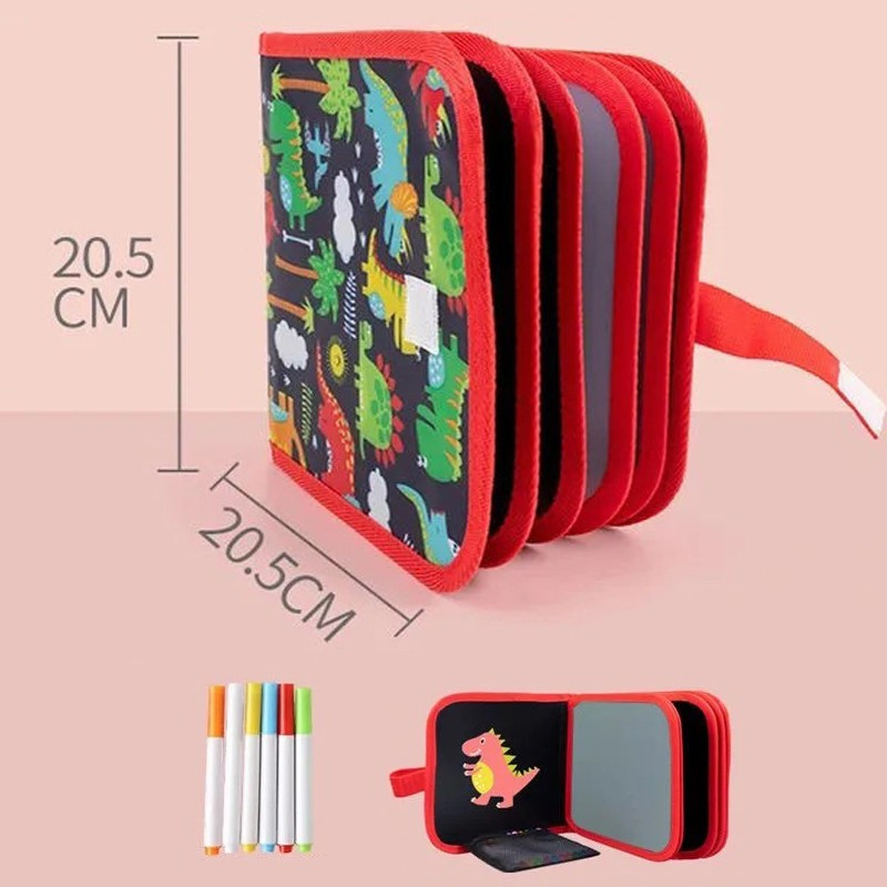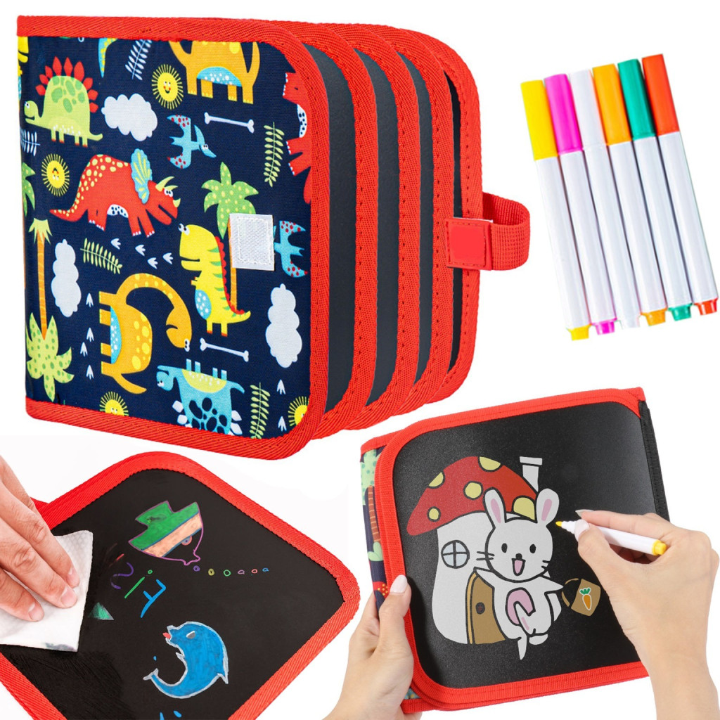 Hordozható krétatábla 10 oldalas füzet formájában 6 db krétafilctoll DINOSZAURUSZOK