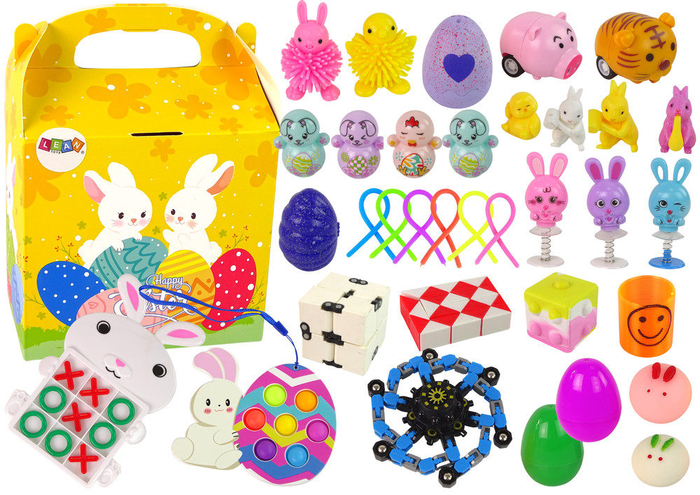 A teljes készlet ünnepi témában készült. Minden szín és elem a húsvétra utal. Ezek a játékok nyújthatók, nyomkodhatók és préselhetők. Ez a legjobb tevékenység a stressz és az ingerlékenység oldására. A készlet 36 darabot tartalmaz.