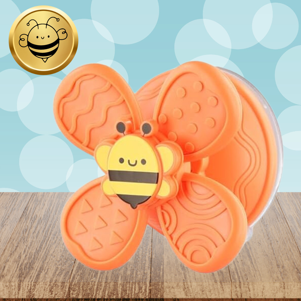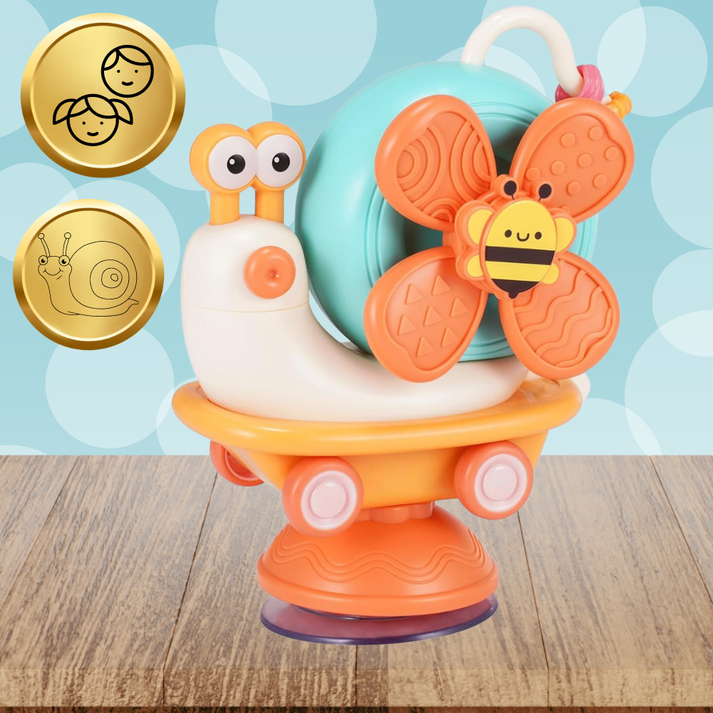 A csiga héján egy virág alakú szélmalom található egy aranyos méhecskével, amely forgatható, stimulálja az érzékeket és fejleszti a gyermek motoros készségeit.