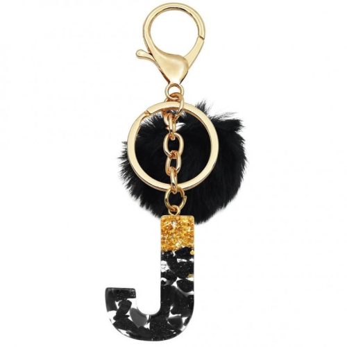 "J" BETŰS kulcstartó, fekete és arany pomponnal, gyanta BRL342J
