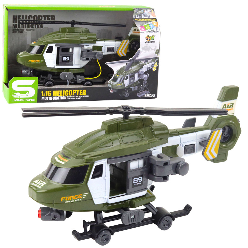 A helikopter fény- és hangeffektusokkal van felszerelve, amelyeket gombokkal lehet aktiválni. A valósághű repülési hangok és fényjelzések fokozzák a szórakoztató élményt. A modell forgó légcsavarokkal rendelkezik, amelyek hitelességet kölcsönöznek, és kerekekkel, amelyek lehetővé teszik a helikopter mozgását a felületeken.