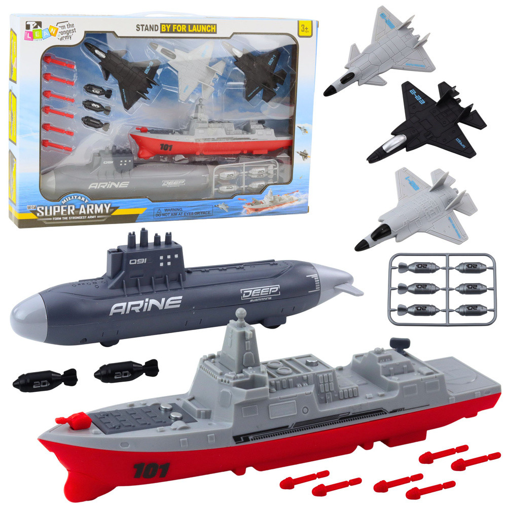A készlet elemei műanyagból készültek, és leegyszerűsített, gyermekbarát formában reprodukálják a katonai járműveket. A modellek a mellékelt rakéták és torpedók rögzítési pontjaival vannak felszerelve, ami még vonzóbbá teszi a játékot. Az egész egy esztétikus, ablakos dobozba van csomagolva – tökéletes ajándéknak.