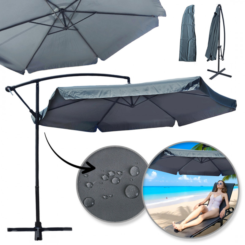 Kerti napernyő konzolos karral: Ez a kerti napernyő tökéletes választás azok számára, akik megbízható napvédelmet keresnek! A maximális funkcionalitást és kényelmet szem előtt tartva tervezték, nemcsak árnyékot, hanem védelmet nyújt a káros UV-sugárzás ellen is. Specifikációk: - Az napernyő tetője ellenáll a szélnek, az esőnek és a napnak (UV50+ szűrő). Az anyag vízálló. - Az napernyő a legmodernebb magasság- és dőlésszög-állító rendszerrel rendelkezik. - Masszív váz és 8 erős borda. A kiváló minőségű kidolgozás tökéletessé teszi az napernyőt még kedvezőtlen időjárási körülmények között is. - A termék összecsukható, a kibontás módja: tekerőkar. Anyag:- Borítóanyag: 100% poliészter, súly 180 g/m2- Váz anyaga: acélKonstrukció:- 6 acél borda 12 x 18 mm- Acéloszlop 48 mm- Talp: keresztMéretek és súly:- Váz átmérője: 300 cm- Magasság: 262 cm- Váz: bordák: 12x18 mm, oszlop átmérője 48 mmSúly: 15 kgCsomag méretei: 198 cm x 32 cm x 15 cm