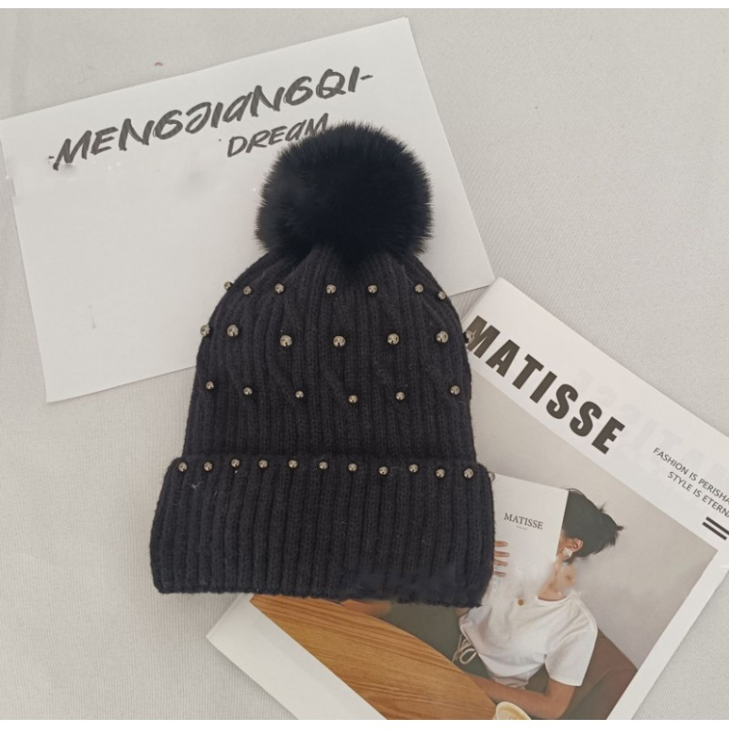 Kötött téli sapka pomponnal és gyöngyökkel, fekete CZ35WZ4