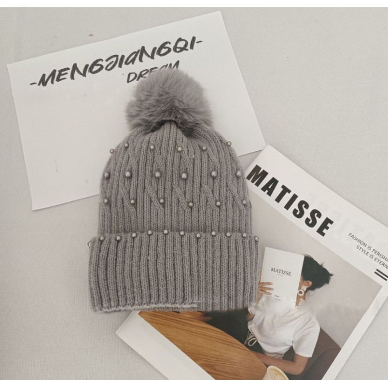 Kötött téli sapka pomponnal és gyöngyökkel, szürke CZ35WZ2