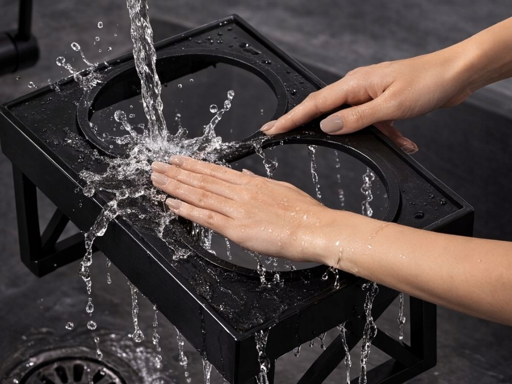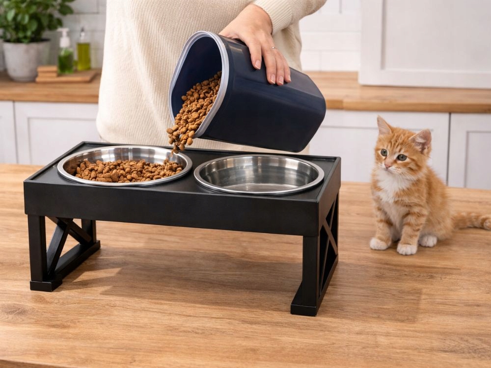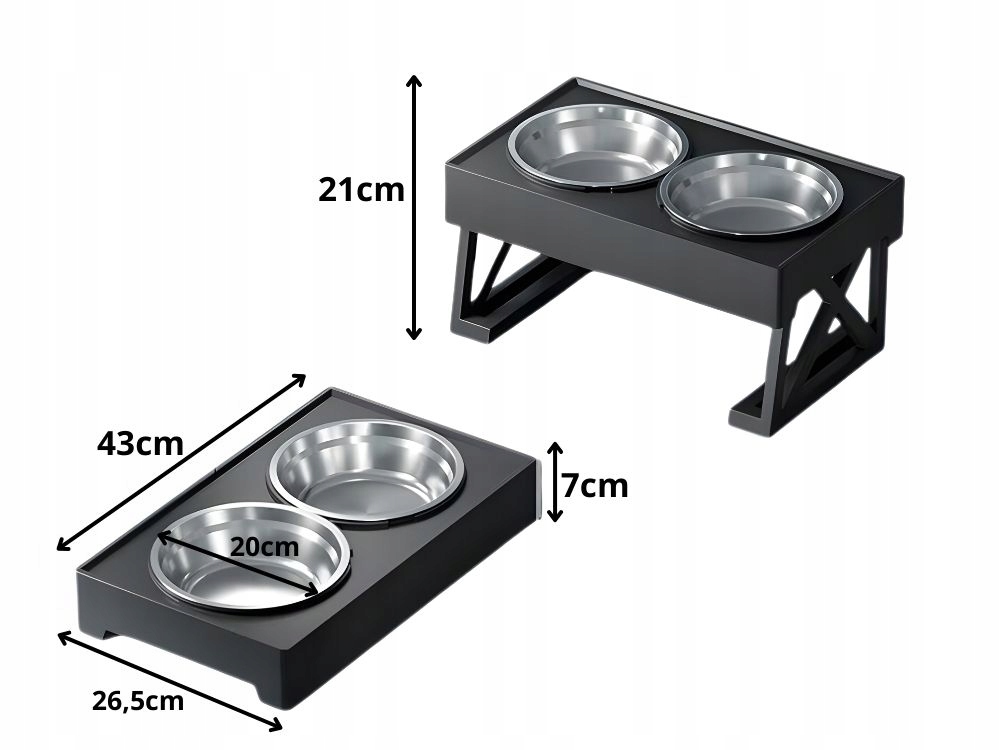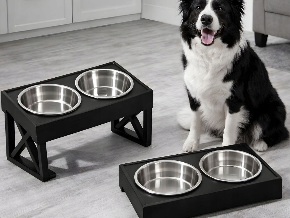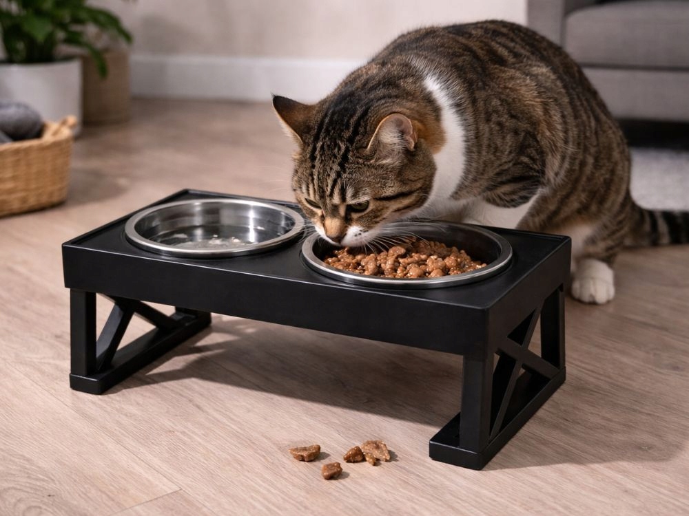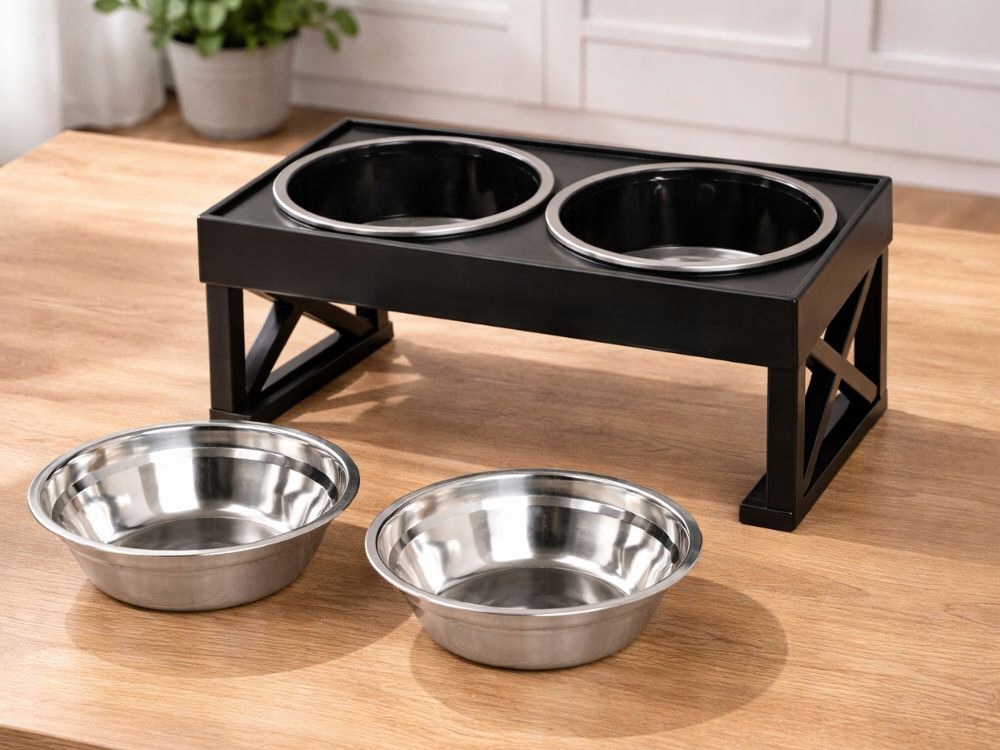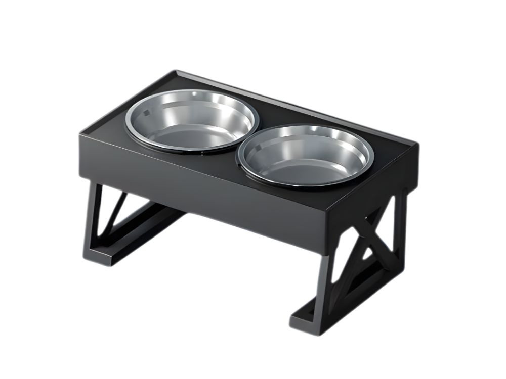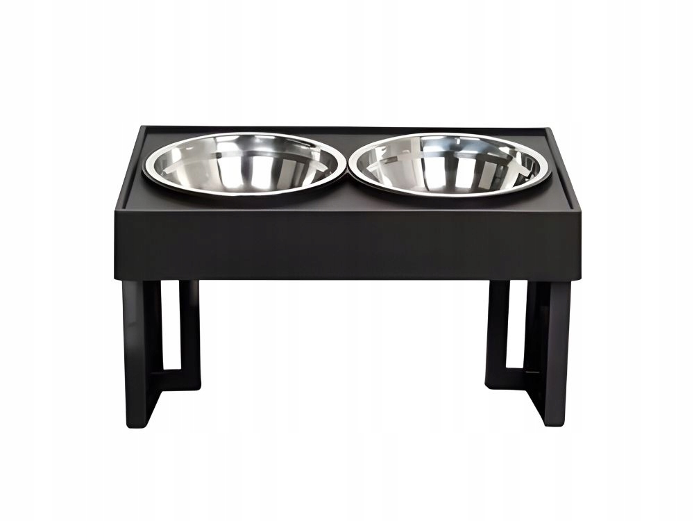A modern, fekete állvány esztétikusan mutat a konyhában vagy a kijelölt etetőhelyen, ugyanakkor stabilitást biztosít étkezés közben .